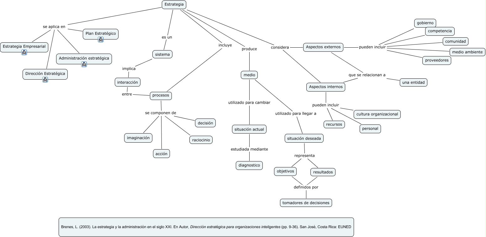 Este Cmap, tiene información relacionada con: Estrategia, Estrategia es un sistema, Estrategia se aplica en Plan Estratégico, Aspectos internos que se relacionan a una entidad, medio utilizado para cambiar situación actual, interacción entre procesos, Estrategia se aplica en Dirección Estratégica, Estrategia incluye procesos, Estrategia considera Aspectos internos, Aspectos externos pueden incluir comunidad, Estrategia considera Aspectos externos, Estrategia se aplica en Estrategia Empresarial, situación deseada representa objetivos, situación actual estudiada mediante diagnostico, Aspectos internos pueden incluir cultura organizacional, Aspectos externos pueden incluir medio ambiente, objetivos definidos por tomadores de decisiones, procesos se componen de raciocinio, Estrategia se aplica en Administración estratégica, Aspectos externos pueden incluir competencia, procesos se componen de acción