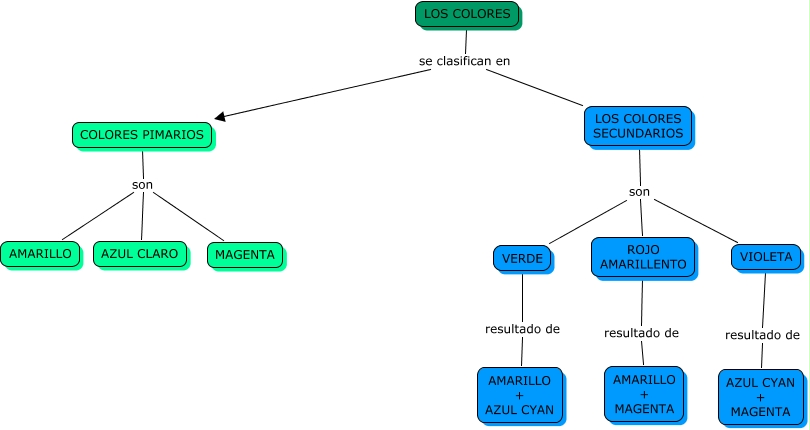 Este Cmap, tiene información relacionada con: LOS COLORES(Marcos), LOS COLORES SECUNDARIOS son ROJO AMARILLENTO, LOS COLORES SECUNDARIOS son VERDE, LOS COLORES se clasifican en COLORES PIMARIOS, VERDE resultado de AMARILLO + AZUL CYAN, COLORES PIMARIOS son AZUL CLARO, LOS COLORES SECUNDARIOS son VIOLETA, COLORES PIMARIOS son MAGENTA, VIOLETA resultado de AZUL CYAN + MAGENTA, ROJO AMARILLENTO resultado de AMARILLO + MAGENTA, COLORES PIMARIOS son AMARILLO, LOS COLORES se clasifican en LOS COLORES SECUNDARIOS