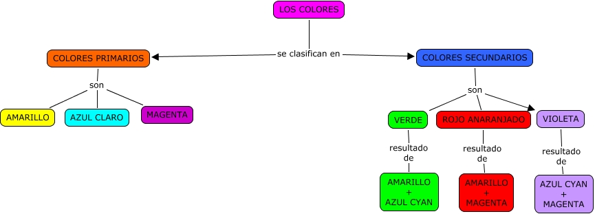 Este Cmap, tiene información relacionada con: LOS COLORES(Sergio), COLORES SECUNDARIOS son VIOLETA, ROJO ANARANJADO resultado de AMARILLO + MAGENTA, LOS COLORES se clasifican en COLORES SECUNDARIOS, COLORES PRIMARIOS son MAGENTA, COLORES SECUNDARIOS son VERDE, COLORES PRIMARIOS son AZUL CLARO, COLORES PRIMARIOS son AMARILLO, VIOLETA resultado de AZUL CYAN + MAGENTA, LOS COLORES se clasifican en COLORES PRIMARIOS, VERDE resultado de AMARILLO + AZUL CYAN, COLORES SECUNDARIOS son ROJO ANARANJADO