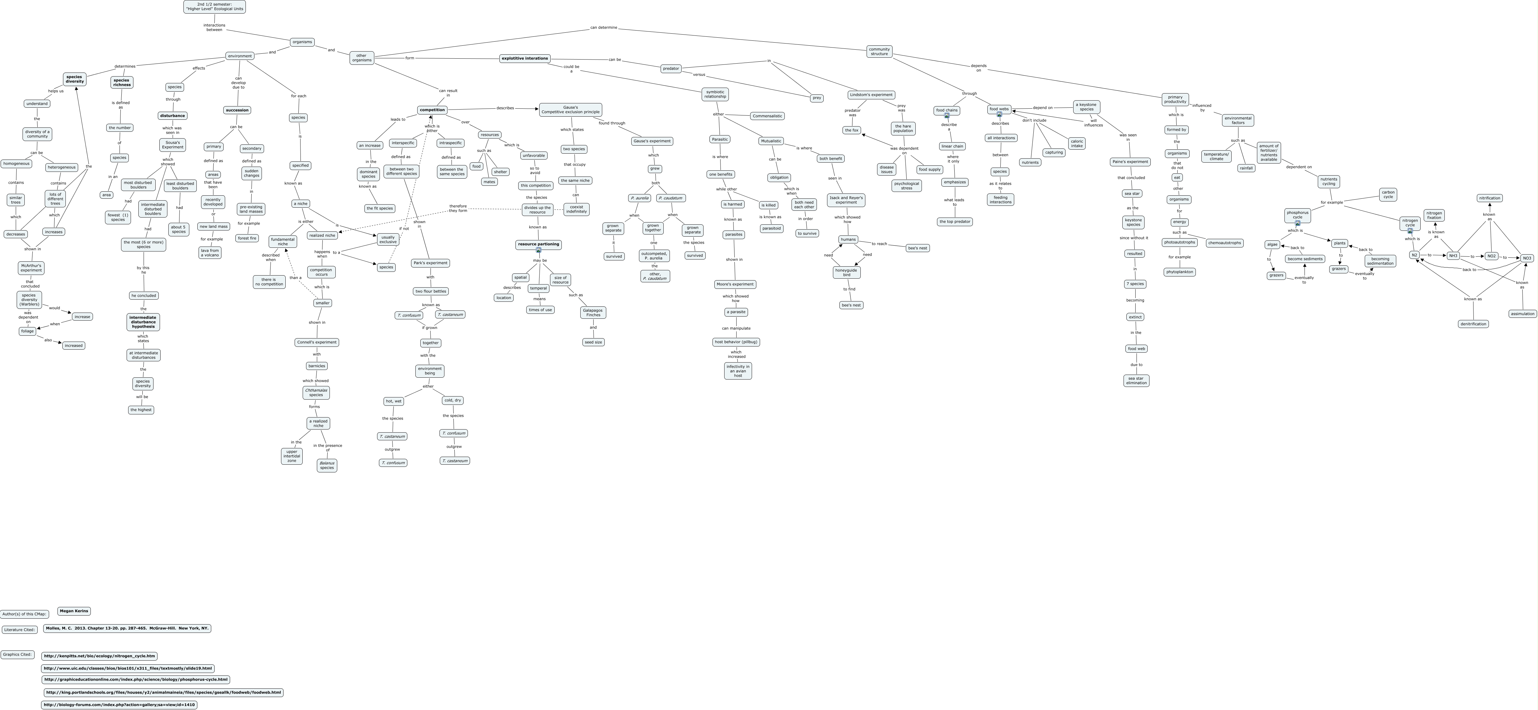This Concept Map, created with IHMC CmapTools, has information related to: Kerins Community Ecosystems Ecology, environmental factors such as rainfall, NH3 to NO2, increase when foliage, specified known as a niche, foliage also increased, food webs don't include nutrients, formed by the organisms, intermediate disturbance hypothesis which states at intermediate disturbances, species richness is defined as the number, competition occurs which is smaller, all interactions between species, nutrients cycling for example carbon cycle, P. aurelia when grown separate, at intermediate disturbances the species diversity, increases the species diversity, Parasitic is where one benefits, similar trees which decreases, both need each other in order to survive, resources such as food, lots of different trees which increases