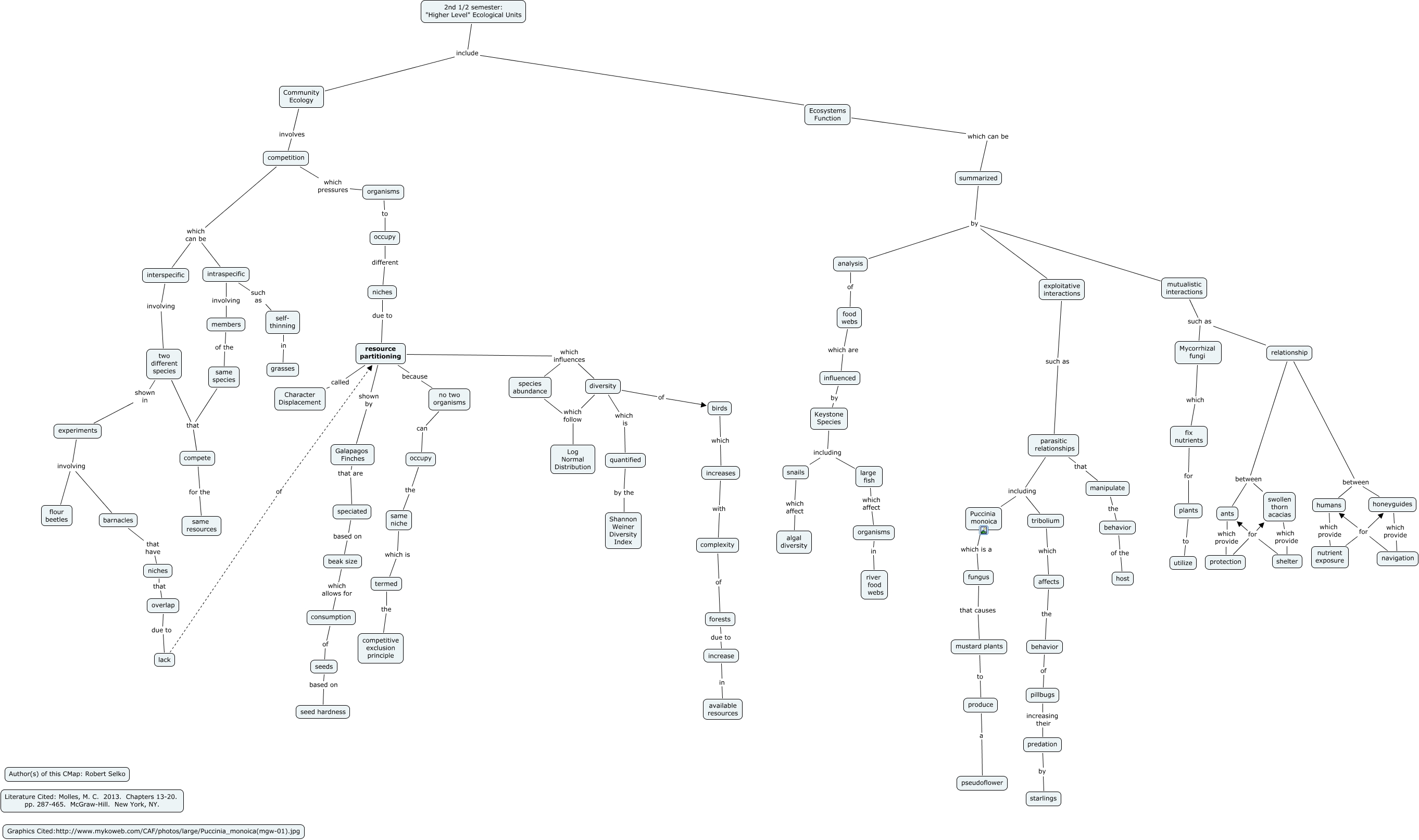 This Concept Map, created with IHMC CmapTools, has information related to: Selko Community Ecosystems Ecology, Ecosystems Function which can be summarized, diversity which follow Log Normal Distribution, summarized by mutualistic interactions, parasitic relationships that manipulate, two different species that compete, relationship between ants, occupy the same niche, analysis of food webs, consumption of seeds, intraspecific involving members, birds which increases, ants which provide protection, protection for ants, beak size which allows for consumption, niches due to resource partitioning, Galapagos Finches that are speciated, niches that overlap, protection for swollen thorn acacias, interspecific involving two different species, resource partitioning called Character Displacement