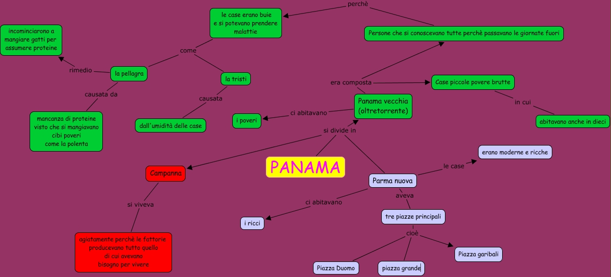 Questa Cmap, creata con IHMC CmapTools, contiene informazioni relative a: Greci, la tristi causata dall'umidità delle case, Campanna si viveva agiatamente perchè le fattorie producevano tutto quello di cui avevano bisogno per vivere, la pellagra causata da mancanza di proteine visto che si mangiavano cibi poveri come la polenta, tre piazze principali cioè Piazza Duomo, Case piccole povere brutte in cui abitavano anche in dieci, la pellagra rimedio incominciarono a mangiare gatti per assumere proteine, PANAMA si divide in Parma nuova, le case erano buie e si potevano prendere malattie come la tristi, le case erano buie e si potevano prendere malattie come la pellagra, Panama vecchia (oltretorrente) ci abitavano i poveri, PANAMA si divide in Panama vecchia (oltretorrente), PANAMA si divide in Campanna, tre piazze principali cioè piazza grande, tre piazze principali cioè Piazza garibali, Persone che si conoscevano tutte perchè passavano le giornate fuori perchè le case erano buie e si potevano prendere malattie, Parma nuova aveva tre piazze principali, Panama vecchia (oltretorrente) era composta Persone che si conoscevano tutte perchè passavano le giornate fuori, Parma nuova le case erano moderne e ricche, Parma nuova ci abitavano i ricci, Panama vecchia (oltretorrente) era composta Case piccole povere brutte