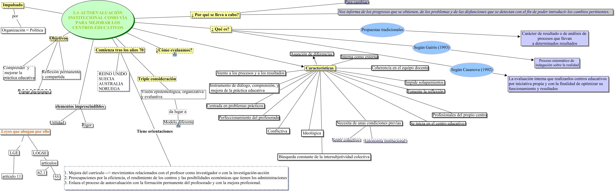 Este Cmap, tiene información relacionada con: Autoevaluación 1, Características ???? Atento a los procesos y a los resultados, Leyes que abogan por ello l LOGSE, Comienza tras los años 70 Tiene orientaciones 1. Mejora del curriculo --> movimientos relacionados con el profesor como investigador o con la investigación-acción 2. Preocupaciones por la eficiencia, el rendimiento de los centros y las posibilidades económicas que tienen los administraciones 3. Enlaza el proceso de autoevaluación con la formación permanente del profesorado y con la mejora profesional., Características ???? Centrada en problemas prácticos, Características ???? Instrumento de diálogo, comprensión, y mejora de la práctica educativa, artículos ???? 62.1, Características ???? Búsqueda constante de la intersubjetividad colectiva, artículos ???? 55, Características ???? Impide solapamientos, Leyes que abogan por ello LGE, LA AUTOEVALUACIÓN INSTITUCIONAL COMO VÍA PARA MEJORAR LOS CENTROS EDUCATIVOS ???? ¿ Qué es?, elementos imprescindibles ???? Utilidad, Características ???? Se inicia en el centro educativo, LA AUTOEVALUACIÓN INSTITUCIONAL COMO VÍA PARA MEJORAR LOS CENTROS EDUCATIVOS ???? Objetivos, Necesita de unas condiciones previas ???? Autonomía institucional, ¿ Por qué se lleva a cabo? ???? Nos informa de los progresos que se obtienen, de los problemas y de las disfunciones que se detectan con el fin de poder introducir los cambios pertinentes., LA AUTOEVALUACIÓN INSTITUCIONAL COMO VÍA PARA MEJORAR LOS CENTROS EDUCATIVOS Triple consideración Visión epistemológica, organizativa y evaluativa, Características ???? Perfeccionamiento del profesorado, LA AUTOEVALUACIÓN INSTITUCIONAL COMO VÍA PARA MEJORAR LOS CENTROS EDUCATIVOS Características, Características ???? Asunción de diferencias