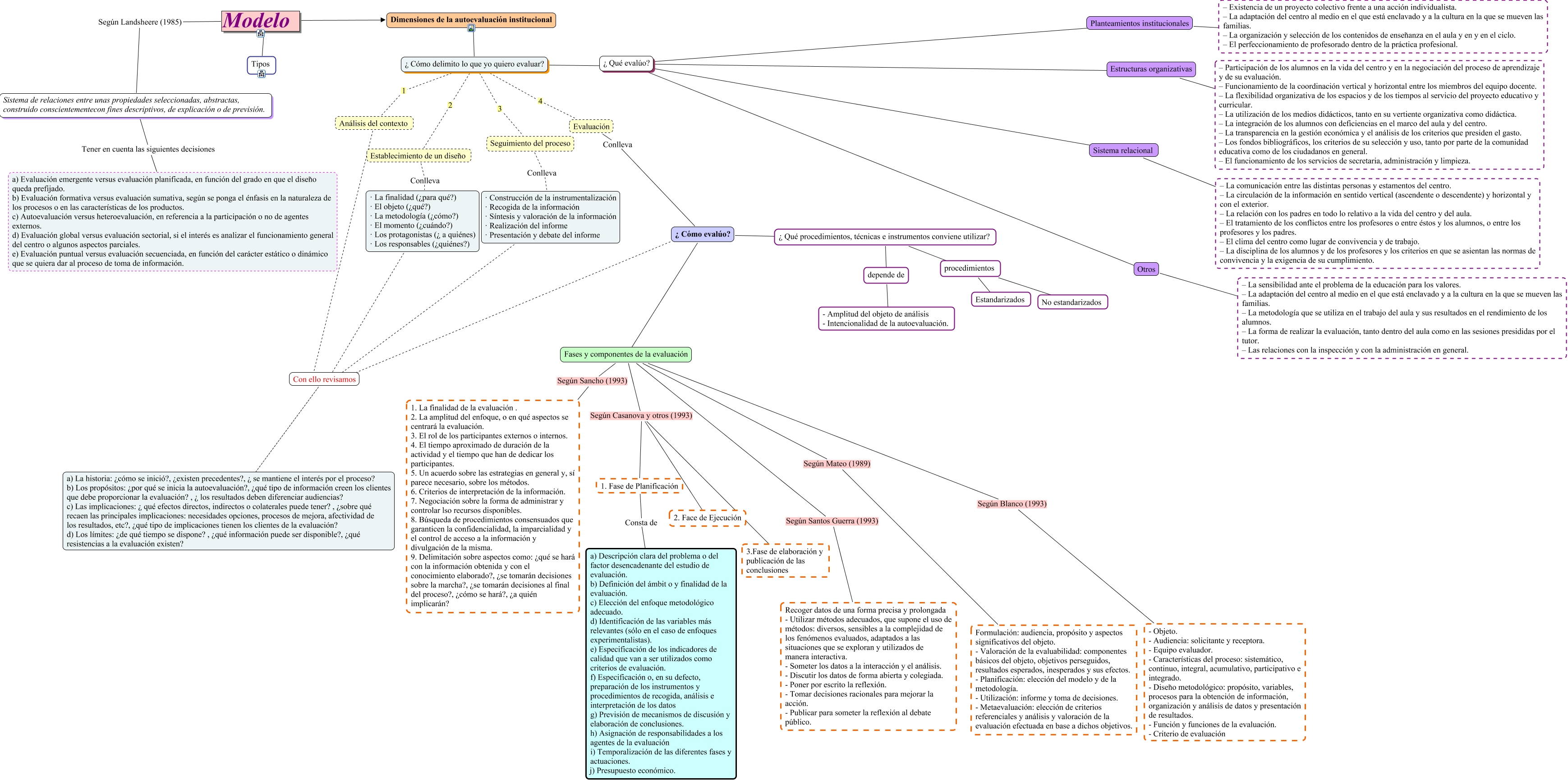 Este Cmap, tiene información relacionada con: Autoevaluación 2, Modelo ???? Dimensiones de la autoevaluación institucional, Estructuras organizativas ???? – Participación de los alumnos en la vida del centro y en la negociación del proceso de aprendizaje y de su evaluación. – Funcionamiento de la coordinación vertical y horizontal entre los miembros del equipo docente. – La flexibilidad organizativa de los espacios y de los tiempos al servicio del proyecto educativo y curricular. – La utilización de los medios didácticos, tanto en su vertiente organizativa como didáctica. – La integración de los alumnos con deficiencias en el marco del aula y del centro. – La transparencia en la gestión económica y el análisis de los criterios que presiden el gasto. – Los fondos bibliográficos, los criterios de su selección y uso, tanto por parte de la comunidad educativa como de los ciudadanos en general. – El funcionamiento de los servicios de secretaria, administración y limpieza., Fases y componentes de la evaluación Según Casanova y otros (1993) 2. Face de Ejecución, ¿ Qué evalúo? ???? Sistema relacional, Evaluación Conlleva ¿ Cómo evalúo?, ¿ Cómo evalúo? ???? Con ello revisamos, Fases y componentes de la evaluación Según Mateo (1989) Formulación: audiencia, propósito y aspectos significativos del objeto. - Valoración de la evaluabilidad: componentes básicos del objeto, objetivos perseguidos, resultados esperados, inesperados y sus efectos. - Planificación: elección del modelo y de la metodología. - Utilización: informe y toma de decisiones. - Metaevaluación: elección de criterios referenciales y análisis y valoración de la evaluación efectuada en base a dichos objetivos., procedimientos ???? Estandarizados, Fases y componentes de la evaluación Según Santos Guerra (1993) Recoger datos de una forma precisa y prolongada - Utilizar métodos adecuados, que supone el uso de métodos: diversos, sensibles a la complejidad de los fenómenos evaluados, adaptados a las situaciones que se exploran y utilizados de manera interactiva. - Someter los datos a la interacción y el análisis. - Discutir los datos de forma abierta y colegiada. - Poner por escrito la reflexión. - Tomar decisiones racionales para mejorar la acción. - Publicar para someter la reflexión al debate público., Sistema relacional ???? – La comunicación entre las distintas personas y estamentos del centro. – La circulación de la información en sentido vertical (ascendente o descendente) y horizontal y con el exterior. – La relación con los padres en todo lo relativo a la vida del centro y del aula. – El tratamiento de los conflictos entre los profesores o entre éstos y los alumnos, o entre los profesores y los padres. – El clima del centro como lugar de convivencia y de trabajo. – La disciplina de los alumnos y de los profesores y los criterios en que se asientan las normas de convivencia y la exigencia de su cumplimiento., ¿ Qué evalúo? ???? Planteamientos institucionales, Establecimiento de un diseño Conlleva · La finalidad (¿para qué?) · El objeto (¿qué?) · La metodología (¿cómo?) · El momento (¿cuándo?) · Los protagonistas (¿ a quiénes) · Los responsables (¿quiénes?), ¿ Cómo delimito lo que yo quiero evaluar? 2 Establecimiento de un diseño, Modelo Según Landsheere (1985) Sistema de relaciones entre unas propiedades seleccionadas, abstractas, construido conscientementecon fines descriptivos, de explicación o de previsión., depende de ???? - Amplitud del objeto de análisis - Intencionalidad de la autoevaluación., ¿ Cómo evalúo? ???? ¿ Qué procedimientos, técnicas e instrumentos conviene utilizar?, Fases y componentes de la evaluación Según Sancho (1993) 1. La finalidad de la evaluación . 2. La amplitud del enfoque, o en qué aspectos se centrará la evaluación. 3. El rol de los participantes externos o internos. 4. El tiempo aproximado de duración de la actividad y el tiempo que han de dedicar los participantes. 5. Un acuerdo sobre las estrategias en general y, sí parece necesario, sobre los métodos. 6. Criterios de interpretación de la información. 7. Negociación sobre la forma de administrar y controlar lso recursos disponibles. 8. Búsqueda de procedimientos consensuados que garanticen la confidencialidad, la imparcialidad y el control de acceso a la información y divulgación de la misma. 9. Delimitación sobre aspectos como: ¿qué se hará con la información obtenida y con el conocimiento elaborado?, ¿se tomarán decisiones sobre la marcha?, ¿se tomarán decisiones al final del proceso?, ¿cómo se hará?, ¿a quién implicarán?, Sistema de relaciones entre unas propiedades seleccionadas, abstractas, construido conscientementecon fines descriptivos, de explicación o de previsión. Tener en cuenta las siguientes decisiones a) Evaluación emergente versus evaluación planificada, en función del grado en que el diseño queda prefijado. b) Evaluación formativa versus evaluación sumativa, según se ponga el énfasis en la naturaleza de los procesos o en las características de los productos. c) Autoevaluación versus heteroevaluación, en referencia a la participación o no de agentes externos. d) Evaluación global versus evaluación sectorial, si el interés es analizar el funcionamiento general del centro o algunos aspectos parciales. e) Evaluación puntual versus evaluación secuenciada, en función del carácter estático o dinámico que se quiera dar al proceso de toma de información., Planteamientos institucionales ???? – Existencia de un proyecto colectivo frente a una acción individualista. – La adaptación del centro al medio en el que está enclavado y a la cultura en la que se mueven las familias. – La organización y selección de los contenidos de enseñanza en el aula y en y en el ciclo. – El perfeccionamiento de profesorado dentro de la práctica profesional., Seguimiento del pr