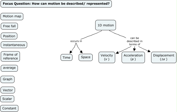 This Concept Map, created with IHMC CmapTools, has information related to: Motion -skeleton cmap - old, 1D motion occurs in Time, 1D motion occurs in Space, 1D motion can be described in terms of Acceleration (a), 1D motion can be described in terms of Velocity (v), 1D motion can be described in terms of Displacement (Δx)