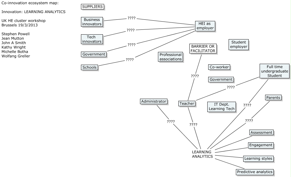 This Concept Map, created with IHMC CmapTools, has information related to: Learning Analytics, LEARNING ANALYTICS ???? Full time undergraduate Student, Teacher ???? Full time undergraduate Student, LEARNING ANALYTICS Assessment, BARRIER OR FACILITATOR ???? Teacher, LEARNING ANALYTICS Learning styles, Tech innovators ???? HEI as employer, LEARNING ANALYTICS ???? Parents, LEARNING ANALYTICS ???? Teacher, Schools ???? HEI as employer, Government ???? HEI as employer, LEARNING ANALYTICS ???? Administrator, Business innovators ???? HEI as employer, LEARNING ANALYTICS Engagement, LEARNING ANALYTICS Predictive analytics