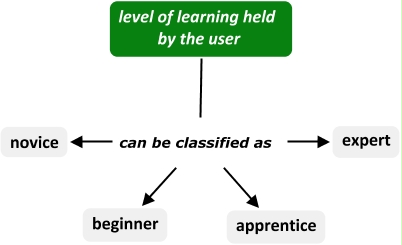 This Concept Map, created with IHMC CmapTools, has information related to: LEVELS, level of learning held by the user can be classified as apprentice, level of learning held by the user can be classified as beginner, level of learning held by the user can be classified as expert, level of learning held by the user can be classified as novice