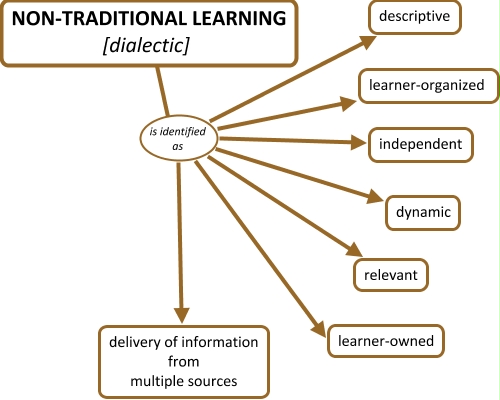 This Concept Map, created with IHMC CmapTools, has information related to: traditional_non3.cmap, NON-TRADITIONAL LEARNING [dialectic] is identified as independent, NON-TRADITIONAL LEARNING [dialectic] is identified as delivery of information from multiple sources, NON-TRADITIONAL LEARNING [dialectic] is identified as dynamic, NON-TRADITIONAL LEARNING [dialectic] is identified as learner-organized, NON-TRADITIONAL LEARNING [dialectic] is identified as descriptive, NON-TRADITIONAL LEARNING [dialectic] is identified as learner-owned, NON-TRADITIONAL LEARNING [dialectic] is identified as relevant