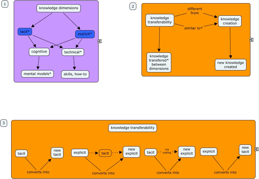 This Concept Map, created with IHMC CmapTools, has information related to: tacit and explicit dimensions, knowledge transferability different from knowledge creation, tacit* technical*, knowledge creation new knowledge created, tacit new explicit, technical* skills, how-to, explicit* cognitive, explicit converts into new tacit, explicit converts into new explicit, knowledge transferability knowledge transfered* between dimensions, cognitive mental models*, knowledge dimensions explicit*, explicit tacit, explicit* technical*, tacit converts into new explicit, knowledge transferability similar to* knowledge creation, tacit via coding new explicit, knowledge dimensions tacit*, tacit* cognitive, tacit converts into new tacit