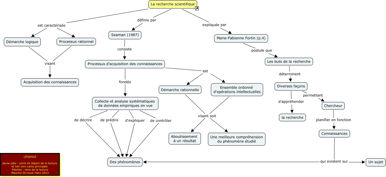 Cette carte de concepts créée avec IHMC CmapTools traite de: Cequ'estlaRechercheScientifique, Connaissances qui existent sur Des phénomènes, Ensemble ordonné d'opérations intellectuelles visant soit Une meilleure compréhension du phénomène étudié, Les buts de la recherche déterminent Diverses façons, Diverses façons permettant Chercheur, Ensemble ordonné d'opérations intellectuelles visant soit Aboutissement à un résultat, La recherche scientifique est caractérisée Processus rationnel, Collecte et analyse systématiques de données empiriques en vue d'expliquer Des phénomènes, Collecte et analyse systématiques de données empiriques en vue de prédire Des phénomènes, Marie-Fabienne Fortin (p.4) postule que Les buts de la recherche, Chercheur planifier en fonction Connaissances, Démarche rationnelle visant soit Aboutissement à un résultat, Connaissances qui existent sur Un sujet, Processus d'acquisition des connaissances est Démarche rationnelle, Collecte et analyse systématiques de données empiriques en vue de décrire Des phénomènes, Démarche rationnelle visant soit Une meilleure compréhension du phénomène étudié, Seaman (1987) consiste Processus d'acquisition des connaissances, La recherche scientifique définie par Seaman (1987), La recherche scientifique expliquée par Marie-Fabienne Fortin (p.4), Démarche logique visant Acquisition des connaissances, Processus d'acquisition des connaissances est Ensemble ordonné d'opérations intellectuelles