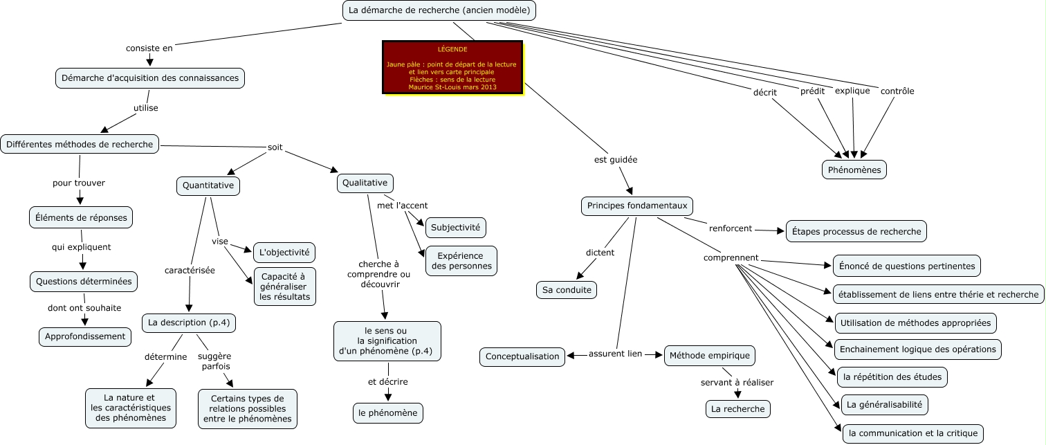 Cette carte de concepts créée avec IHMC CmapTools traite de: Démarche de recherche_ancien, Principes fondamentaux assurent lien Méthode empirique, Principes fondamentaux comprennent établissement de liens entre thérie et recherche, Principes fondamentaux dictent Sa conduite, le sens ou la signification d'un phénomène (p.4) et décrire le phénomène, Quantitative caractérisée La description (p.4), La démarche de recherche (ancien modèle) explique Phénomènes, La démarche de recherche (ancien modèle) prédit Phénomènes, Principes fondamentaux comprennent la communication et la critique, Qualitative met l'accent Subjectivité, Éléments de réponses qui expliquent Questions déterminées, Démarche d'acquisition des connaissances utilise Différentes méthodes de recherche, Principes fondamentaux renforcent Étapes processus de recherche, Quantitative vise L'objectivité, Différentes méthodes de recherche soit Quantitative, Différentes méthodes de recherche pour trouver Éléments de réponses, La démarche de recherche (ancien modèle) décrit Phénomènes, Questions déterminées dont ont souhaite Approfondissement, Méthode empirique servant à réaliser La recherche, La description (p.4) détermine La nature et les caractéristiques des phénomènes, La démarche de recherche (ancien modèle) est guidée Principes fondamentaux