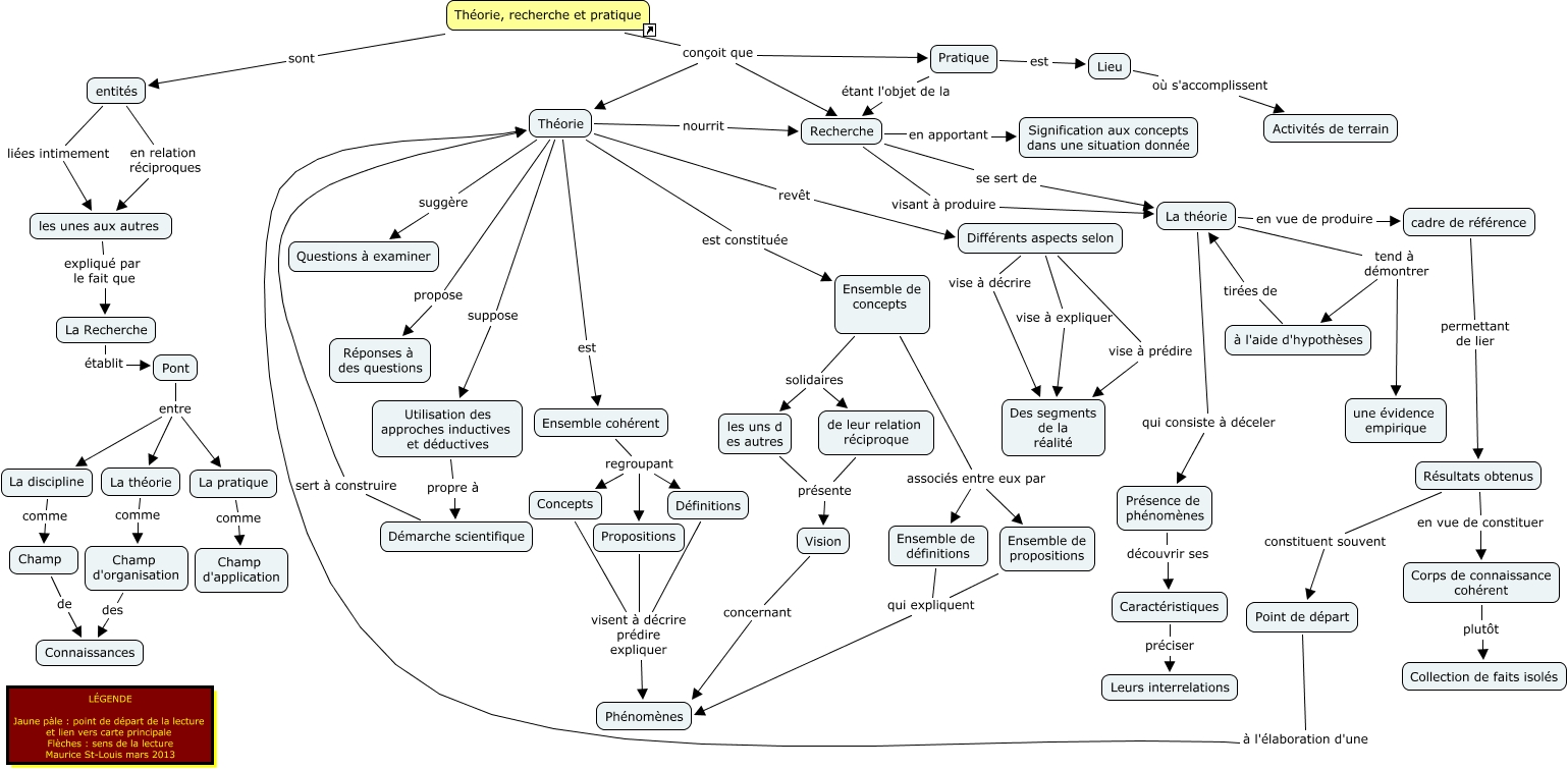 Cette carte de concepts créée avec IHMC CmapTools traite de: LiensTheorieRecherchePratique, La Recherche établit Pont, Théorie, recherche et pratique conçoit que Recherche, les unes aux autres expliqué par le fait que La Recherche, Champ de Connaissances, Différents aspects selon vise à prédire Des segments de la réalité, Définitions visent à décrire prédire expliquer Phénomènes, Propositions visent à décrire prédire expliquer Phénomènes, Théorie suppose Utilisation des approches inductives et déductives, Vision concernant Phénomènes, Caractéristiques préciser Leurs interrelations, Concepts visent à décrire prédire expliquer Phénomènes, Ensemble de définitions qui expliquent Phénomènes, Champ d'organisation des Connaissances, Ensemble de concepts associés entre eux par Ensemble de propositions, Ensemble de concepts solidaires de leur relation réciproque, cadre de référence permettant de lier Résultats obtenus, Théorie est constituée Ensemble de concepts, Théorie revêt Différents aspects selon, Pont entre La discipline, La pratique comme Champ d'application