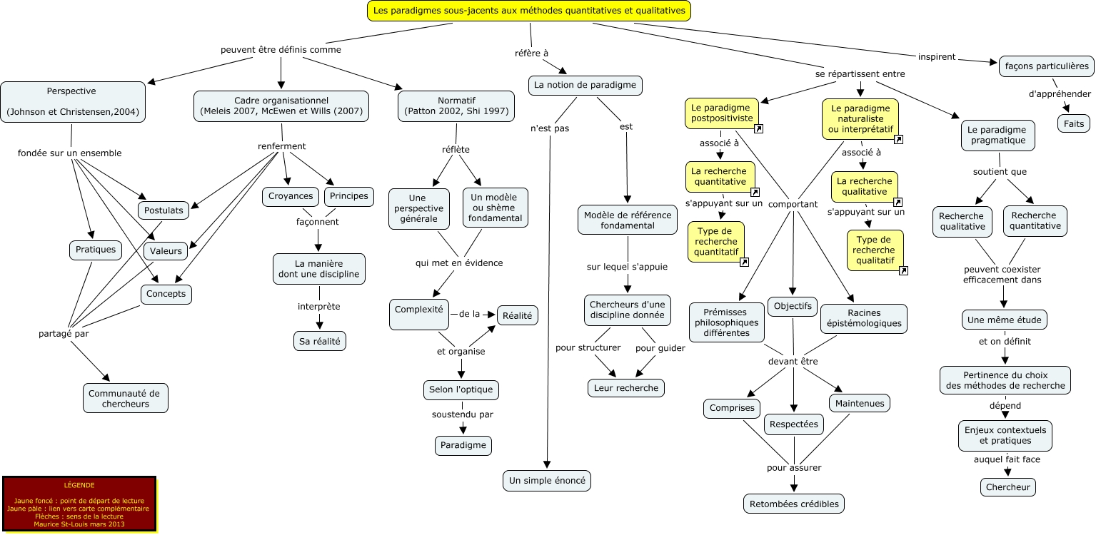Cette carte de concepts créée avec IHMC CmapTools traite de: Les paradigmes sous-jacents aux méthodes quantitatives et qualitatives, Chercheurs d'une discipline donnée pour guider Leur recherche, Prémisses philosophiques différentes devant être Maintenues, Une perspective générale qui met en évidence Complexité, Objectifs devant être Respectées, Cadre organisationnel (Meleis 2007, McEwen et Wills (2007) renferment Valeurs, Normatif (Patton 2002, Shi 1997) réflète Un modèle ou shème fondamental, Principes façonnent La manière dont une discipline, La notion de paradigme n'est pas Un simple énoncé, Le paradigme naturaliste ou interprétatif associé à La recherche qualitative, Complexité et organise Selon l'optique, Postulats partagé par Communauté de chercheurs, Perspective (Johnson et Christensen,2004) fondée sur un ensemble Concepts, Les paradigmes sous-jacents aux méthodes quantitatives et qualitatives peuvent être définis comme Normatif (Patton 2002, Shi 1997), Les paradigmes sous-jacents aux méthodes quantitatives et qualitatives se répartissent entre Le paradigme pragmatique, Les paradigmes sous-jacents aux méthodes quantitatives et qualitatives inspirent façons particulières, Racines épistémologiques devant être Respectées, Les paradigmes sous-jacents aux méthodes quantitatives et qualitatives se répartissent entre Le paradigme postpositiviste, Le paradigme postpositiviste comportant Objectifs, Le paradigme postpositiviste comportant Racines épistémologiques, Recherche quantitative peuvent coexister efficacement dans Une même étude