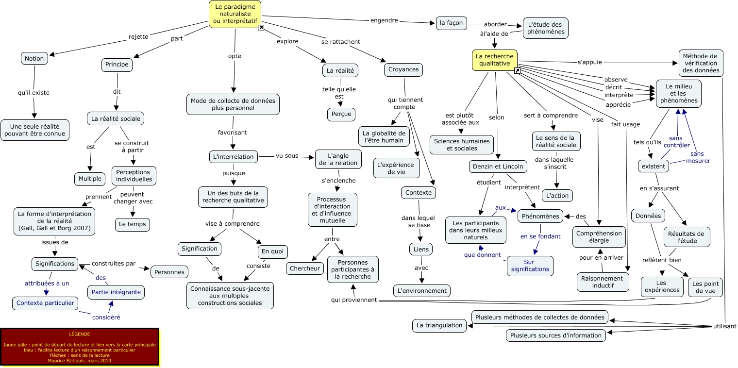 Cette carte de concepts créée avec IHMC CmapTools traite de: Le paradigme naturaliste ou interprétatif, Croyances qui tiennent compte La globalité de l'être humain, Le paradigme naturaliste ou interprétatif se rattachent Croyances, Denzin et Lincoln interprètent Phénomènes, Significations construites par Personnes, Perceptions individuelles peuvent changer avec Le temps, La recherche qualitative sert à comprendre Le sens de la réalité sociale, Personnes participantes à la recherche entre Chercheur, existent en s'assurant Résultats de l'étude, Contexte dans lequel se tisse Liens, Croyances qui tiennent compte Contexte, La recherche qualitative s'appuie Méthode de vérification des données, La réalité telle qu'elle est Perçue, Liens avec L'environnement, La recherche qualitative interprète Le milieu et les phénomènes, Phénomènes en se fondant Sur significations, Le paradigme naturaliste ou interprétatif part Principe, Mode de collecte de données plus personnel favorisant L'interrelation, Processus d'interaction et d'influence mutuelle entre Personnes participantes à la recherche, La réalité sociale se construit à partir Perceptions individuelles, Principe dit La réalité sociale