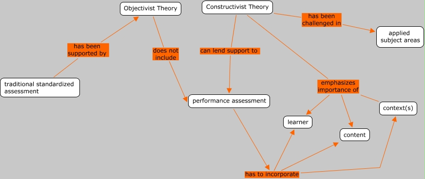 This Concept Map, created with IHMC CmapTools, has information related to: linking phrases, Constructivist Theory emphasizes importance of context(s), performance assessment has to incorporate content, traditional standardized assessment has been supported by Objectivist Theory, performance assessment has to incorporate learner, performance assessment has to incorporate context(s), Constructivist Theory emphasizes importance of learner, Objectivist Theory does not include performance assessment, Constructivist Theory can lend support to performance assessment, Constructivist Theory emphasizes importance of content