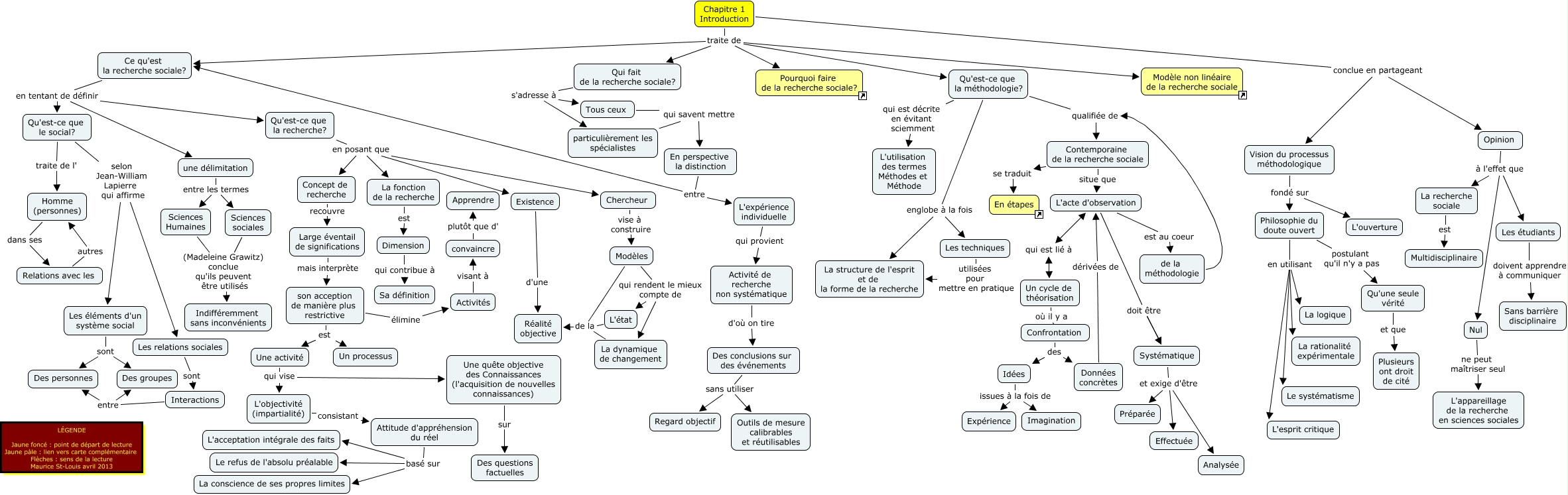 Cette carte de concepts créée avec IHMC CmapTools traite de: Chapitre I Introduction, Qu'une seule vérité et que Plusieurs ont droit de cité, L'expérience individuelle qui provient Activité de recherche non systématique, Systématique et exige d'être Effectuée, Tous ceux qui savent mettre En perspective la distinction, Qu'est-ce que la méthodologie? qui est décrite en évitant sciemment L'utilisation des termes Méthodes et Méthode, Homme (personnes) dans ses Relations avec les, Vision du processus méthodologique fondé sur Philosophie du doute ouvert, Les éléments d'un système social sont Des personnes, Relations avec les autres Homme (personnes), Les relations sociales sont Interactions, Ce qu'est la recherche sociale? en tentant de définir Qu'est-ce que le social?, Activité de recherche non systématique d'où on tire Des conclusions sur des événements, Un cycle de théorisation où il y a Confrontation, Qui fait de la recherche sociale? s'adresse à Tous ceux, Systématique et exige d'être Préparée, Des conclusions sur des événements sans utiliser Regard objectif, Attitude d'appréhension du réel basé sur L'acceptation intégrale des faits, Les techniques utilisées pour mettre en pratique La structure de l'esprit et de la forme de la recherche, Chapitre 1 Introduction conclue en partageant Vision du processus méthodologique, Opinion à l'effet que Nul