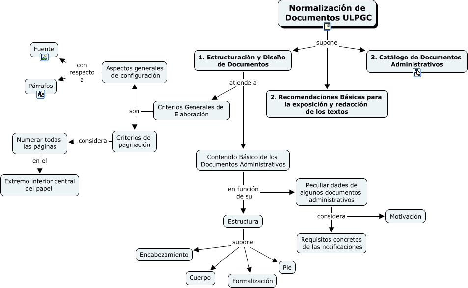 Este Cmap, tiene información relacionada con: Normalizacion Documentos ULPGC, Normalización de Documentos ULPGC supone 2. Recomendaciones Básicas para la exposición y redacción de los textos, Normalización de Documentos ULPGC supone 1. Estructuración y Diseño de Documentos, 1. Estructuración y Diseño de Documentos atiende a Contenido Básico de los Documentos Administrativos, Peculiaridades de algunos documentos administrativos considera Requisitos concretos de las notificaciones, Numerar todas las páginas en el Extremo inferior central del papel, Estructura supone Cuerpo, Aspectos generales de configuración con respecto a Fuente, Normalización de Documentos ULPGC supone 3. Catálogo de Documentos Administrativos, Contenido Básico de los Documentos Administrativos en función de su Estructura, Aspectos generales de configuración con respecto a Párrafos, Criterios Generales de Elaboración son Aspectos generales de configuración, Criterios de paginación considera Numerar todas las páginas, Estructura supone Encabezamiento, Criterios Generales de Elaboración son Criterios de paginación, Estructura supone Pie, 1. Estructuración y Diseño de Documentos atiende a Criterios Generales de Elaboración, Peculiaridades de algunos documentos administrativos considera Motivación, Estructura supone Formalización, Contenido Básico de los Documentos Administrativos en función de su Peculiaridades de algunos documentos administrativos
