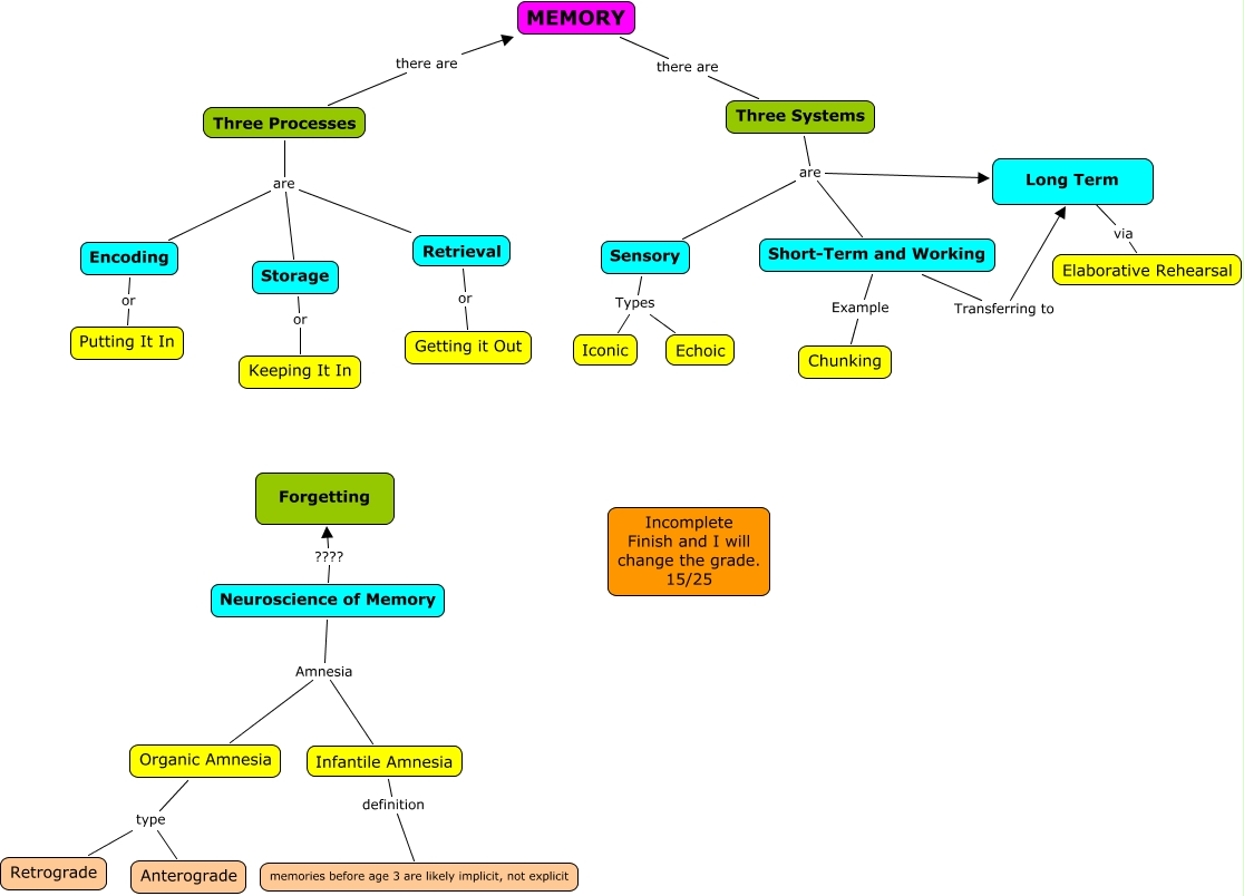 This Concept Map, created with IHMC CmapTools, has information related to: Rutledge - Ch 6 15, Neuroscience of Memory ???? Forgetting, Short-Term and Working Transferring to, via Elaborative Rehearsal, Neuroscience of Memory Amnesia Infantile Amnesia, Three Processes are Retrieval, Organic Amnesia type Retrograde, Three Systems are Short-Term and Working, Neuroscience of Memory Amnesia Organic Amnesia, Three Processes are Storage, Sensory Types Iconic, MEMORY there are Three Systems, Sensory Types Echoic, Retrieval or Getting it Out, Encoding or Putting It In, Three Processes are Encoding, Infantile Amnesia definition memories before age 3 are likely implicit, not explicit, Short-Term and Working Example Chunking, Three Processes there are MEMORY, Three Systems are Sensory, Storage or Keeping It In