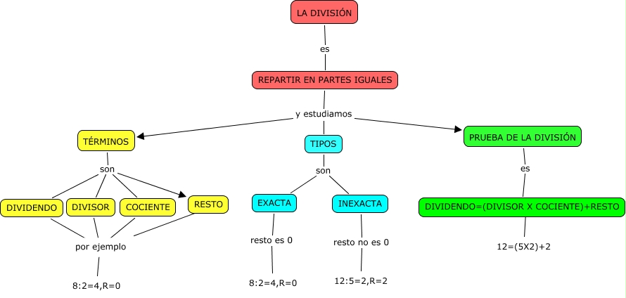 Este Cmap, tiene información relacionada con: LA DIVISIÓN(Raúl,Iria y Miguel J), DIVISOR ???? 8:2=4,R=0, INEXACTA resto no es 0 12:5=2,R=2, TÉRMINOS son RESTO, REPARTIR EN PARTES IGUALES y estudiamos PRUEBA DE LA DIVISIÓN, REPARTIR EN PARTES IGUALES y estudiamos TIPOS, COCIENTE ???? 8:2=4,R=0, TÉRMINOS son COCIENTE, TIPOS son INEXACTA, REPARTIR EN PARTES IGUALES y estudiamos TÉRMINOS, TÉRMINOS son DIVISOR, DIVIDENDO=(DIVISOR X COCIENTE)+RESTO ???? 12=(5X2)+2, TIPOS son EXACTA, PRUEBA DE LA DIVISIÓN es DIVIDENDO=(DIVISOR X COCIENTE)+RESTO, DIVIDENDO ???? 8:2=4,R=0, LA DIVISIÓN es REPARTIR EN PARTES IGUALES, EXACTA resto es 0 8:2=4,R=0, RESTO ???? por ejemplo, TÉRMINOS son DIVIDENDO