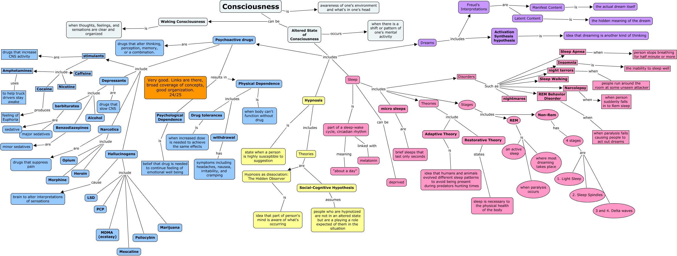 This Concept Map, created with IHMC CmapTools, has information related to: Catherine Bower Ch 4 24, REM is when paralysis occurs, Hallucinogens include Psilocybin, Hallucinogens include Mescaline, Psychoactive drugs include stimulants, REM Behavior Disorder when when paralysis fails causing people to act out dreams, Hallucinogens include LSD, Sleep Apnea when person stops breathing for half minute or more, Freud's Interpretations are Latent Content, Latent Content is the hidden meaning of the dream, Depressants include Alcohol, Hallucinogens include PCP, Restorative Theory states sleep is necessary to the physical health of the body, 4 stages are 2. Sleep Spindles, Physical Dependence is when body can't function without drug, Amphetamines uses to help truck drivers stay awake, Social-Cognitive Hypothesis assumes people who are hypnotized are not in an altered state but are a playing a role expected of them in the situation, Theories are Social-Cognitive Hypothesis, Disorders Such as Sleep Apnea, Disorders Such as Narcolepsy, Adaptive Theory is idea that humans and animals evolved different sleep patterns to avoid being present during predators hunting times