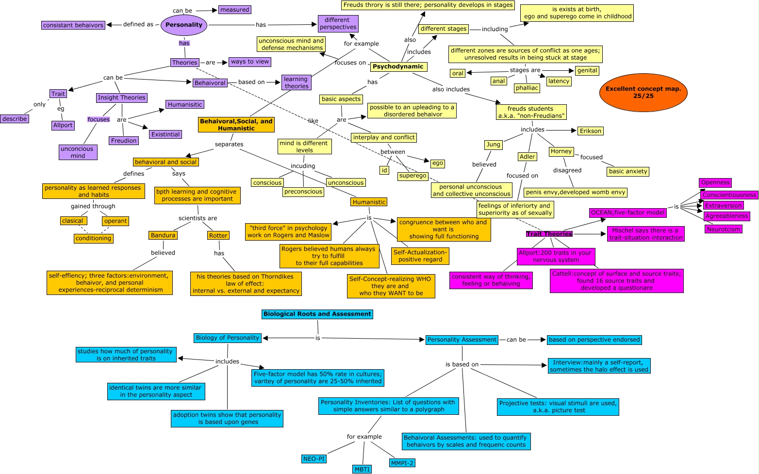 This Concept Map, created with IHMC CmapTools, has information related to: Williams Ch. 13 25, Rotter has his theories based on Thorndikes law of effect: internal vs. external and expectancy, clasical ???? conditioning, different zones are sources of conflict as one ages; unresolved results in being stuck at stage stages are latency, Biology of Personality includes adoption twins show that personality is based upon genes, Humanistic is "third force" in psychology work on Rogers and Maslow, freuds students a.k.a. "non-Freudians" includes Adler, Personality has Theories, Psychodynamic also includes freuds students a.k.a. "non-Freudians", Insight Theories are Humanisitic, personality as learned responses and habits gained through clasical, Psychodynamic has basic aspects, Trait eg Allport, Personality defined as consistant behaivors, Personality Inventories: List of questions with simple answers similar to a polygraph for example MBTI, bpth learning and cognitive processes are important scientists are Bandura, Insight Theories focuses unconcious mind, OCEAN;five-factor model is Extraversion, Personality can be measured, Personality Assessment is based on Personality Inventories: List of questions with simple answers similar to a polygraph, Behaivoral based on learning theories
