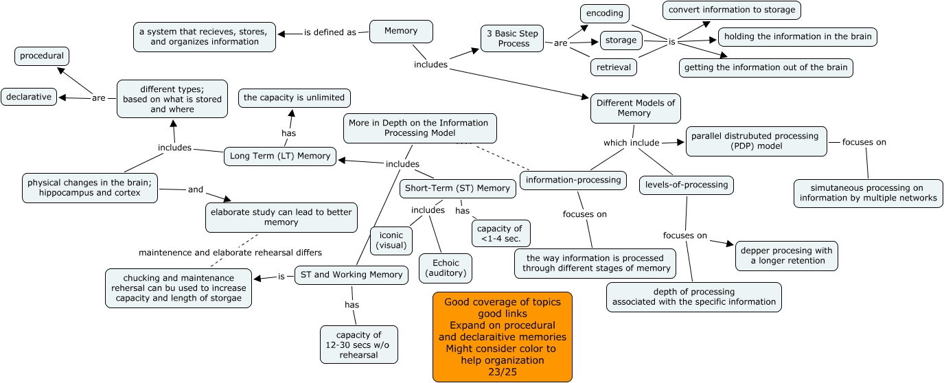 This Concept Map, created with IHMC CmapTools, has information related to: WIlliams Ch 6 23, More in Depth on the Information Processing Model ???? information-processing, elaborate study can lead to better memory maintenence and elaborate rehearsal differs chucking and maintenance rehersal can bu used to increase capacity and length of storgae, encoding is holding the information in the brain, 3 Basic Step Process are retrieval, Memory includes 3 Basic Step Process, different types; based on what is stored and where are declarative, Different Models of Memory which include parallel distrubuted processing (PDP) model, physical changes in the brain; hippocampus and cortex and elaborate study can lead to better memory, ST and Working Memory has capacity of 12-30 secs w/o rehearsal, storage is getting the information out of the brain, Long Term (LT) Memory has the capacity is unlimited, Memory is defined as a system that recieves, stores, and organizes information, ST and Working Memory is chucking and maintenance rehersal can bu used to increase capacity and length of storgae, 3 Basic Step Process are encoding, retrieval is getting the information out of the brain, storage is holding the information in the brain, More in Depth on the Information Processing Model includes Long Term (LT) Memory, encoding is getting the information out of the brain, storage is convert information to storage, retrieval is convert information to storage