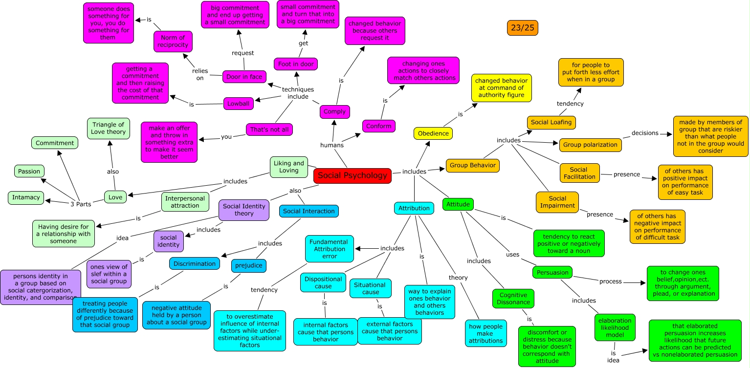 This Concept Map, created with IHMC CmapTools, has information related to: Josh R Ch 12 23, Dispositional cause is internal factors cause that persons behavior, Situational cause is external factors cause that persons behavior, prejudice is negative attitude held by a person about a social group, Social Psychology also Social Interaction, Group Behavior includes Social Facilitation, Social Identity theory includes social identity, Social Loafing tendency for people to put forth less effort when in a group, Door in face request big commitment and end up getting a small commitment, Persuasion includes elaboration likelihood model, Discrimination is treating people differently because of prejudice toward that social group, Persuasion process to change ones belief,opinion,ect. through argument, plead, or explanation, Social Psychology includes Obedience, Attribution includes Fundamental Attribution error, Group polarization decisions made by members of group that are riskier than what people not in the group would consider, Social Psychology also Social Identity theory, Liking and Loving includes Love, Fundamental Attribution error tendency to overestimate influence of internal factors while under- estimating situational factors, Social Psychology includes Attitude, Love 3 Parts Intamacy, Social Facilitation presence of others has positive impact on performance of easy task