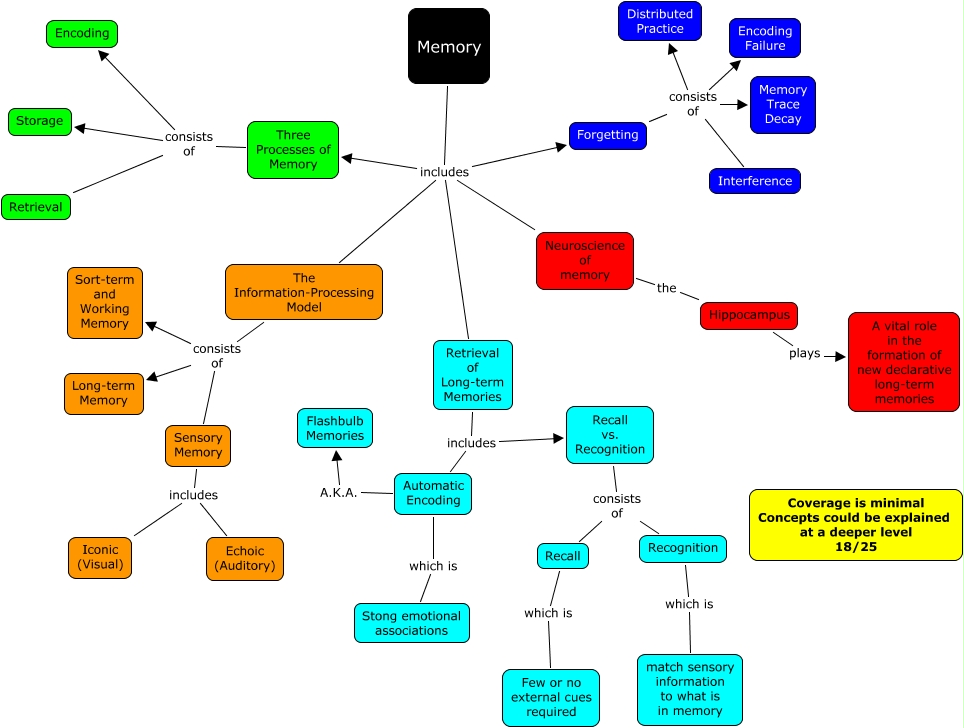 This Concept Map, created with IHMC CmapTools, has information related to: Luther Ch. 6 18, Automatic Encoding A.K.A. Flashbulb Memories, Retrieval of Long-term Memories includes Automatic Encoding, Memory includes Retrieval of Long-term Memories, Hippocampus plays A vital role in the formation of new declarative long-term memories, Memory includes The Information-Processing Model, Automatic Encoding which is Stong emotional associations, Forgetting consists of Memory Trace Decay, Neuroscience of memory the Hippocampus, Forgetting consists of Distributed Practice, Three Processes of Memory consists of Encoding, Forgetting consists of Encoding Failure, Three Processes of Memory consists of Storage, The Information-Processing Model consists of Long-term Memory, Recall vs. Recognition consists of Recall, Memory includes Forgetting, Memory includes Neuroscience of memory, Memory includes Three Processes of Memory, The Information-Processing Model consists of Sensory Memory, Sensory Memory includes Iconic (Visual), Retrieval of Long-term Memories includes Recall vs. Recognition