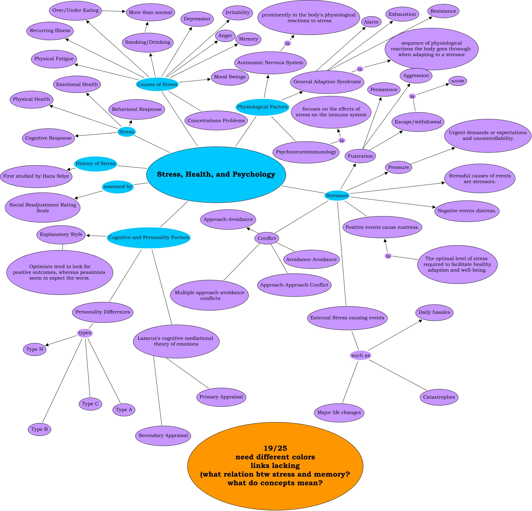 This Concept Map, created with IHMC CmapTools, has information related to: ElizabethHoke Ch11 19, Smoking/Drinking ???? More than normal, Personality Differences types Type B, Psychoneuroimmunology is focuses on the effects of stress on the immune system, Stress, Health, and Psychology Cognitive and Personality Factors Explanatory Style, Fustration ???? Persistence, Conflict ???? Avoidance-Avoidance, Stress, Health, and Psychology Physiological Factors Autonomic Nervous System, General Adaption Syndrome ???? Alarm, Stress, Health, and Psychology Causes of Stress Depression, Stress, Health, and Psychology Cognitive and Personality Factors Lazarus's cognitive-mediational theory of emotions, Stress, Health, and Psychology Stress Physical Health, The optimal level of stress required to facilitate healthy adaption and well-being. is Positive events cause eustress., Stress, Health, and Psychology Stressors Positive events cause eustress., Stress, Health, and Psychology Causes of Stress Irritability, Fustration ???? Aggression, Stress, Health, and Psychology Cognitive and Personality Factors Personality Differences, External Stress causing events such as Daily hassles, Stress, Health, and Psychology Causes of Stress Physical Fatigue, Lazarus's cognitive-mediational theory of emotions ???? Primary Appraisal, General Adaption Syndrome ???? Exhaustion