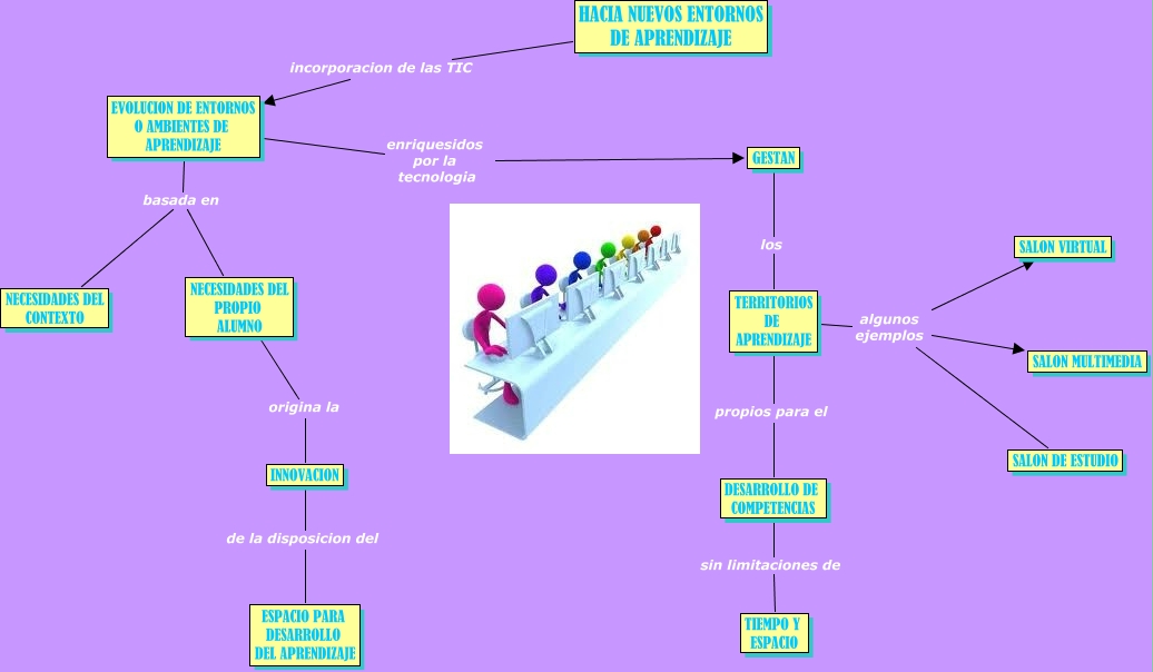 Este Cmap, tiene información relacionada con: CAPITULO 12. NUEVOS ENTORNOS DE APRENDIZAJE, EVOLUCION DE ENTORNOS O AMBIENTES DE APRENDIZAJE basada en NECESIDADES DEL CONTEXTO, TERRITORIOS DE APRENDIZAJE algunos ejemplos SALON VIRTUAL, EVOLUCION DE ENTORNOS O AMBIENTES DE APRENDIZAJE basada en NECESIDADES DEL PROPIO ALUMNO, GESTAN los TERRITORIOS DE APRENDIZAJE, INNOVACION de la disposicion del ESPACIO PARA DESARROLLO DEL APRENDIZAJE, HACIA NUEVOS ENTORNOS DE APRENDIZAJE incorporacion de las TIC EVOLUCION DE ENTORNOS O AMBIENTES DE APRENDIZAJE, TERRITORIOS DE APRENDIZAJE algunos ejemplos SALON MULTIMEDIA, EVOLUCION DE ENTORNOS O AMBIENTES DE APRENDIZAJE enriquesidos por la tecnologia GESTAN, TERRITORIOS DE APRENDIZAJE propios para el DESARROLLO DE COMPETENCIAS, TERRITORIOS DE APRENDIZAJE algunos ejemplos SALON DE ESTUDIO, DESARROLLO DE COMPETENCIAS sin limitaciones de TIEMPO Y ESPACIO, NECESIDADES DEL PROPIO ALUMNO origina la INNOVACION