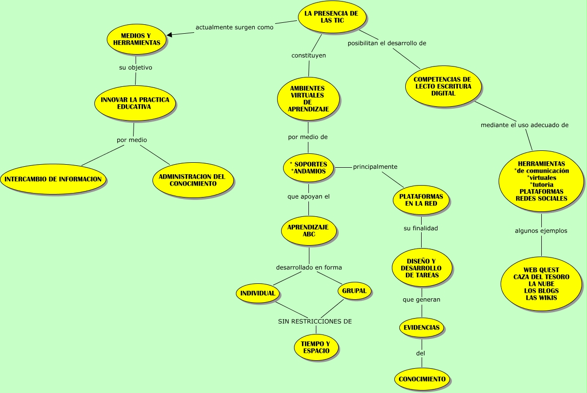 Este Cmap, tiene información relacionada con: CAPITULO 6. PRESENCIA DE LAS TIC, DISEÑO Y DESARROLLO DE TAREAS que generan EVIDENCIAS, AMBIENTES VIRTUALES DE APRENDIZAJE por medio de * SOPORTES *ANDAMIOS, EVIDENCIAS del CONOCIMIENTO, * SOPORTES *ANDAMIOS que apoyan el APRENDIZAJE ABC, PLATAFORMAS EN LA RED su finalidad DISEÑO Y DESARROLLO DE TAREAS, MEDIOS Y HERRAMIENTAS su objetivo INNOVAR LA PRACTICA EDUCATIVA, LA PRESENCIA DE LAS TIC posibilitan el desarrollo de COMPETENCIAS DE LECTO ESCRITURA DIGITAL, COMPETENCIAS DE LECTO ESCRITURA DIGITAL mediante el uso adecuado de HERRAMIENTAS *de comunicación *virtuales *tutoria PLATAFORMAS REDES SOCIALES, INNOVAR LA PRACTICA EDUCATIVA por medio INTERCAMBIO DE INFORMACION, LA PRESENCIA DE LAS TIC actualmente surgen como MEDIOS Y HERRAMIENTAS, * SOPORTES *ANDAMIOS principalmente PLATAFORMAS EN LA RED, APRENDIZAJE ABC desarrollado en forma GRUPAL, GRUPAL SIN RESTRICCIONES DE TIEMPO Y ESPACIO, HERRAMIENTAS *de comunicación *virtuales *tutoria PLATAFORMAS REDES SOCIALES algunos ejemplos WEB QUEST CAZA DEL TESORO LA NUBE LOS BLOGS LAS WIKIS, INNOVAR LA PRACTICA EDUCATIVA por medio ADMINISTRACION DEL CONOCIMIENTO, INDIVIDUAL SIN RESTRICCIONES DE TIEMPO Y ESPACIO, LA PRESENCIA DE LAS TIC constituyen AMBIENTES VIRTUALES DE APRENDIZAJE, APRENDIZAJE ABC desarrollado en forma INDIVIDUAL