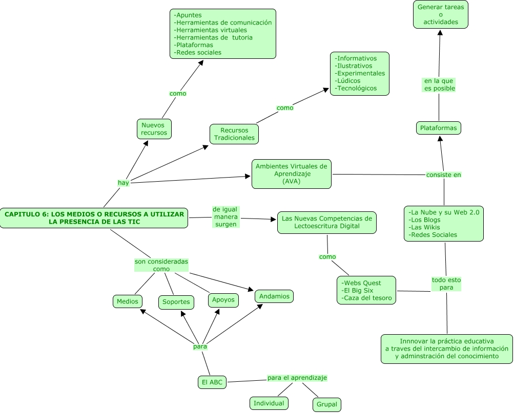 Este Cmap, tiene información relacionada con: CAPITULO 6 LOS MEDIOS O RECURSOS A UTILIZAR LA PRESENCIA DE LAS TIC, CAPITULO 6: LOS MEDIOS O RECURSOS A UTILIZAR LA PRESENCIA DE LAS TIC son consideradas como Apoyos, El ABC para Andamios, CAPITULO 6: LOS MEDIOS O RECURSOS A UTILIZAR LA PRESENCIA DE LAS TIC son consideradas como Soportes, CAPITULO 6: LOS MEDIOS O RECURSOS A UTILIZAR LA PRESENCIA DE LAS TIC son consideradas como Andamios, El ABC para Medios, CAPITULO 6: LOS MEDIOS O RECURSOS A UTILIZAR LA PRESENCIA DE LAS TIC hay Recursos Tradicionales, El ABC para el aprendizaje Grupal, Nuevos recursos como -Apuntes -Herramientas de comunicación -Herramientas virtuales -Herramientas de tutoria -Plataformas -Redes sociales, CAPITULO 6: LOS MEDIOS O RECURSOS A UTILIZAR LA PRESENCIA DE LAS TIC de igual manera surgen Las Nuevas Competencias de Lectoescritura Digital, Ambientes Virtuales de Aprendizaje (AVA) consiste en Plataformas, Plataformas en la que es posible Generar tareas o actividades, Ambientes Virtuales de Aprendizaje (AVA) consiste en -La Nube y su Web 2.0 -Los Blogs -Las Wikis -Redes Sociales, CAPITULO 6: LOS MEDIOS O RECURSOS A UTILIZAR LA PRESENCIA DE LAS TIC hay Nuevos recursos, CAPITULO 6: LOS MEDIOS O RECURSOS A UTILIZAR LA PRESENCIA DE LAS TIC son consideradas como Medios, CAPITULO 6: LOS MEDIOS O RECURSOS A UTILIZAR LA PRESENCIA DE LAS TIC hay Ambientes Virtuales de Aprendizaje (AVA), El ABC para Apoyos, Recursos Tradicionales como -Informativos -Ilustrativos -Experimentales -Lúdicos -Tecnológicos, -La Nube y su Web 2.0 -Los Blogs -Las Wikis -Redes Sociales todo esto para Innnovar la práctica educativa a traves del intercambio de información y adminstración del conocimiento, -Webs Quest -El Big Six -Caza del tesoro todo esto para Innnovar la práctica educativa a traves del intercambio de información y adminstración del conocimiento, Las Nuevas Competencias de Lectoescritura Digital como -Webs Quest -El Big Six -Caza del tesoro