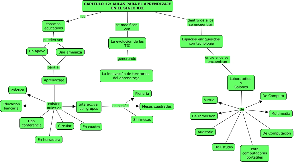 Este Cmap, tiene información relacionada con: CAPITULO 12 AULAS PARA EL APRENDIZAJE EN EL SIGLO XXI, Interacciva por grupos en sesión Sin mesas, Aprendizaje existen aulas de Interacciva por grupos, Aprendizaje existen aulas de En cuadro, Laboratotios y Salones de De Inmersion, Espacios educativos pueden ser Una amenaza, Laboratotios y Salones de De Computo, Aprendizaje existen aulas de Educación bancaria, Aprendizaje existen aulas de Circular, CAPITULO 12: AULAS PARA EL APRENDIZAJE EN EL SIGLO XXI dentro de ellos se encuentran Espacios enriquesidos con tecnología, Un apoyo para el Aprendizaje, Una amenaza para el Aprendizaje, Espacios educativos pueden ser Un apoyo, Laboratotios y Salones de Multimedia, Aprendizaje existen aulas de En herradura, Laboratotios y Salones de De Computación, Laboratotios y Salones de Auditorio, Laboratotios y Salones de Virtual, Aprendizaje existen aulas de Tipo conferencia, Laboratotios y Salones de Para computadoras portatiles, CAPITULO 12: AULAS PARA EL APRENDIZAJE EN EL SIGLO XXI los Espacios educativos