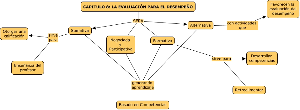 Este Cmap, tiene información relacionada con: CAPITULO 8 LA EVALUACIÓN PARA EL DESEMPEÑO, Sumativa sirve para Otorgar una calificación, Formativa sirve para Desarrollar competencias, Negociada y Participativa generando aprendizaje Basado en Competencias, CAPITULO 8: LA EVALUACIÓN PARA EL DESEMPEÑO SERA Formativa, Formativa sirve para Retroalimentar, CAPITULO 8: LA EVALUACIÓN PARA EL DESEMPEÑO SERA Alternativa, CAPITULO 8: LA EVALUACIÓN PARA EL DESEMPEÑO SERA Negociada y Participativa, Formativa generando aprendizaje Basado en Competencias, Sumativa generando aprendizaje Basado en Competencias, Sumativa sirve para Enseñanza del profesor, CAPITULO 8: LA EVALUACIÓN PARA EL DESEMPEÑO SERA Sumativa, Alternativa con actividades que Favorecen la evaluación del desempeño, Alternativa generando aprendizaje Basado en Competencias