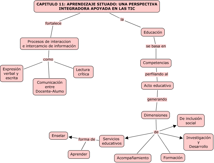 Este Cmap, tiene información relacionada con: CAPITULO 11 APRENDIZAJE SITUADO UNA PERSPECTIVA INTEGRADORA APOYADA EN LAS TIC, CAPITULO 11: APRENDIZAJE SITUADO: UNA PERSPECTIVA INTEGRADORA APOYADA EN LAS TIC fortalece Procesos de interaccion e intercamcio de información, Servicios educativos forma de Aprender, Procesos de interaccion e intercamcio de información como Lectura crítica, Dimensiones de Acompañamiento, Dimensiones de Investigación y Desarrollo, Procesos de interaccion e intercamcio de información como Expresión verbal y escrita, Educación se basa en Competencias, Dimensiones de Servicios educativos, CAPITULO 11: APRENDIZAJE SITUADO: UNA PERSPECTIVA INTEGRADORA APOYADA EN LAS TIC la Educación, Procesos de interaccion e intercamcio de información como Comunicación entre Docente-Alumo, Servicios educativos forma de Enselar, Acto educativo generando Dimensiones, Competencias perfilando al Acto educativo, Dimensiones de De inclusión social, Dimensiones de Formación