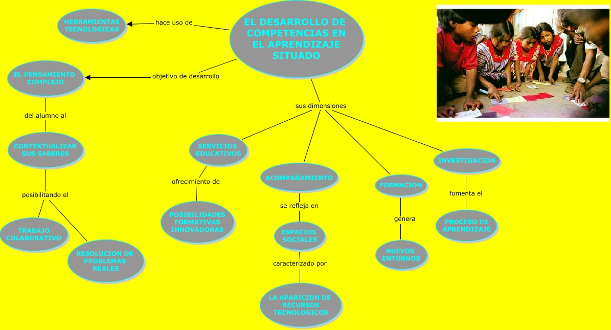 Este Cmap, tiene información relacionada con: CAPITULO 11. DESARROLLO DE COMPETENCIAS EN EL APRENDIZAJE SITUADO, ESPACIOS SOCIALES caracterizado por LA APARICION DE RECURSOS TECNOLOGICOS, EL DESARROLLO DE COMPETENCIAS EN EL APRENDIZAJE SITUADO hace uso de HERRAMIENTAS TECNOLOGICAS, EL DESARROLLO DE COMPETENCIAS EN EL APRENDIZAJE SITUADO sus dimensiones INVESTIGACION, CONTEXTUALIZAR SUS SABERES posibilitando el RESOLUCION DE PROBLEMAS REALES, EL PENSAMIENTO COMPLEJO del alumno al CONTEXTUALIZAR SUS SABERES, EL DESARROLLO DE COMPETENCIAS EN EL APRENDIZAJE SITUADO sus dimensiones FORMACION, EL DESARROLLO DE COMPETENCIAS EN EL APRENDIZAJE SITUADO objetivo de desarrollo EL PENSAMIENTO COMPLEJO, EL DESARROLLO DE COMPETENCIAS EN EL APRENDIZAJE SITUADO sus dimensiones ACOMPAÑAMIENTO, EL DESARROLLO DE COMPETENCIAS EN EL APRENDIZAJE SITUADO sus dimensiones SERVICIOS EDUCATIVOS, ACOMPAÑAMIENTO se refleja en ESPACIOS SOCIALES, INVESTIGACION fomenta el PROCESO DE APRENDIZAJE, SERVICIOS EDUCATIVOS ofrecimiento de POSIBILIDADES FORMATIVAS INNOVADORAS, CONTEXTUALIZAR SUS SABERES posibilitando el TRABAJO COLABORATIVO, FORMACION genera NUEVOS ENTORNOS