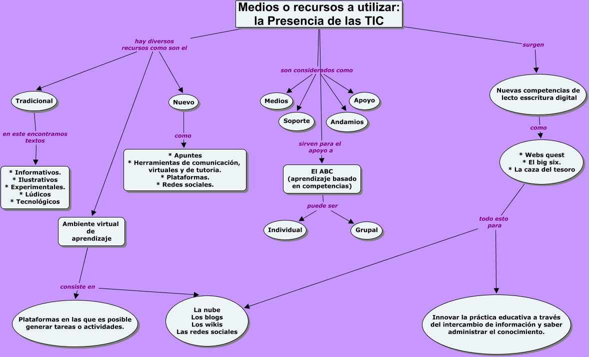 Este Cmap, tiene información relacionada con: Capitulo 1.6, Ambiente virtual de aprendizaje consiste en Plataformas en las que es posible generar tareas o actividades., Medios o recursos a utilizar: la Presencia de las TIC hay diversos recursos como son el Nuevo, Medios o recursos a utilizar: la Presencia de las TIC son considerados como Medios, Medios o recursos a utilizar: la Presencia de las TIC son considerados como Apoyo, Medios o recursos a utilizar: la Presencia de las TIC sirven para el apoyo a El ABC (aprendizaje basado en competencias), * Webs quest * El big six. * La caza del tesoro todo esto para Innovar la práctica educativa a través del intercambio de información y saber administrar el conocimiento., Tradicional en este encontramos textos * Informativos. * Ilustrativos * Experimentales. * Lúdicos * Tecnológicos, Ambiente virtual de aprendizaje consiste en La nube Los blogs Los wikis Las redes sociales, Medios o recursos a utilizar: la Presencia de las TIC son considerados como Soporte, Medios o recursos a utilizar: la Presencia de las TIC hay diversos recursos como son el Tradicional, Medios o recursos a utilizar: la Presencia de las TIC hay diversos recursos como son el Ambiente virtual de aprendizaje, Medios o recursos a utilizar: la Presencia de las TIC surgen Nuevas competencias de lecto esscritura digital, Nuevo como * Apuntes * Herramientas de comunicación, virtuales y de tutoria. * Plataformas. * Redes sociales., Medios o recursos a utilizar: la Presencia de las TIC son considerados como Andamios, Nuevas competencias de lecto esscritura digital como * Webs quest * El big six. * La caza del tesoro, El ABC (aprendizaje basado en competencias) puede ser Grupal, * Webs quest * El big six. * La caza del tesoro todo esto para La nube Los blogs Los wikis Las redes sociales, El ABC (aprendizaje basado en competencias) puede ser Individual