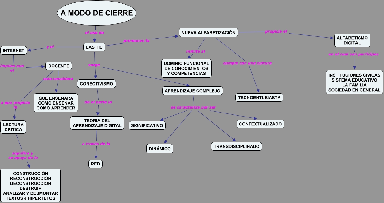 Este Cmap, tiene información relacionada con: capitulo 2.14, APRENDIZAJE COMPLEJO se caracteriza por ser CONTEXTUALIZADO, INTERNET implica que el DOCENTE, NUEVA ALFABETIZACIÓN remite al DOMINIO FUNCIONAL DE CONOCIMIENTOS Y COMPETENCIAS, DOCENTE este considera QUE ENSEÑARÁ COMO ENSEÑAR COMO APRENDER, APRENDIZAJE COMPLEJO se caracteriza por ser SIGNIFICATIVO, LAS TIC surge CONECTIVISMO, NUEVA ALFABETIZACIÓN propicia el ALFABETISMO DIGITAL, LECTURA CRITICA significa y se apoya de la CONSTRUCCIÓN RECONSTRUCCIÓN DECONSTRUCCIÓN DESTRUIR ANALIZAR Y DESMONTAR TEXTOS e HIPERTETOS, LAS TIC promueve la NUEVA ALFABETIZACIÓN, CONECTIVISMO de el parte la TEORIA DEL APRENDIZAJE DIGITAL, LAS TIC y el INTERNET, NUEVA ALFABETIZACIÓN cumple con una cultura TECNOENTUSIASTA, A MODO DE CIERRE el uso de LAS TIC, APRENDIZAJE COMPLEJO se caracteriza por ser DINÁMICO, ALFABETISMO DIGITAL en el cual son participes INSTITUCIONES CÍVICAS SISTEMA EDUCATIVO LA FAMILIA SOCIEDAD EN GENERAL, TEORIA DEL APRENDIZAJE DIGITAL a través de la RED, LAS TIC surge APRENDIZAJE COMPLEJO, DOCENTE a que propicie la LECTURA CRITICA, APRENDIZAJE COMPLEJO se caracteriza por ser TRANSDISCIPLINADO