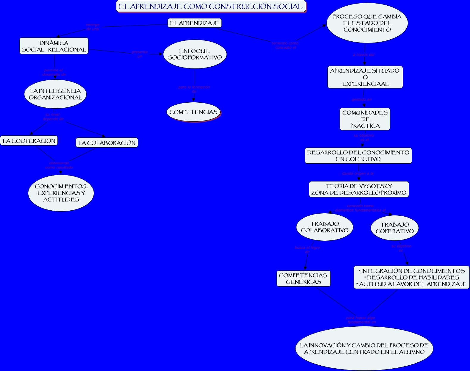 Este Cmap, tiene información relacionada con: capitulo 1.2, TEORIA DE VYGOTSKY ZONA DE DESARROLLO PRÓXIMO teniendo como elementos fundamentales el TRABAJO COPERATIVO, TEORIA DE VYGOTSKY ZONA DE DESARROLLO PRÓXIMO teniendo como elementos fundamentales el TRABAJO COLABORATIVO, EL APRENDIZAJE emerge de una DINÁMICA SOCIAL - RELACIONAL, DESARROLLO DEL CONOCIMIENTO EN COLECTIVO dando origen a la TEORIA DE VYGOTSKY ZONA DE DESARROLLO PRÓXIMO, APRENDIZAJE SITUADO O EXPERIENCIAAL gestado en COMUNIDADES DE PRÁCTICA, ENFOQUE SOCIOFORMATIVO para la formación de COMPETENCIAS, LA COOPERACIÓN obteniendo como resultado CONOCIMIENTOS, EXPERIENCIAS Y ACTITUDES, DINÁMICA SOCIAL - RELACIONAL permite el desarrollo de LA INTELIGENCIA ORGANIZACIONAL, EL APRENDIZAJE teniendo como concepto el PROCESO QUE CAMBIA EL ESTADO DEL CONOCIMIENTO, LA INTELIGENCIA ORGANIZACIONAL su nivel depende de LA COOPERACIÓN, LA INTELIGENCIA ORGANIZACIONAL su nivel depende de LA COLABORACIÓN, TRABAJO COPERATIVO su objetivo es * INTEGRACIÓN DE CONOCIMIENTOS * DESARROLLO DE HABILIDADES * ACTITUD A FAVOR DEL APRENDIZAJE, TRABAJO COLABORATIVO busca el logro de COMPETENCIAS GENÉRICAS, COMUNIDADES DE PRÁCTICA su objetivo es el DESARROLLO DEL CONOCIMIENTO EN COLECTIVO, COMPETENCIAS GENÉRICAS para lograr algo fundamental en LA INNOVACIÓN Y CAMBIO DEL PROCESO DE APRENDIZAJE CENTRADO EN EL ALUMNO, DINÁMICA SOCIAL - RELACIONAL presenta un ENFOQUE SOCIOFORMATIVO, LA COLABORACIÓN obteniendo como resultado CONOCIMIENTOS, EXPERIENCIAS Y ACTITUDES, * INTEGRACIÓN DE CONOCIMIENTOS * DESARROLLO DE HABILIDADES * ACTITUD A FAVOR DEL APRENDIZAJE para lograr algo fundamental en LA INNOVACIÓN Y CAMBIO DEL PROCESO DE APRENDIZAJE CENTRADO EN EL ALUMNO, PROCESO QUE CAMBIA EL ESTADO DEL CONOCIMIENTO a través del APRENDIZAJE SITUADO O EXPERIENCIAAL