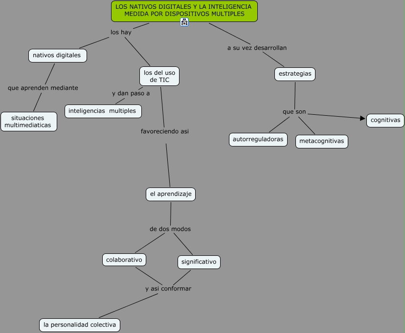 Este Cmap, tiene información relacionada con: CAPITULO 13, LOS NATIVOS DIGITALES Y LA INTELIGENCIA MEDIDA POR DISPOSITIVOS MULTIPLES los hay nativos digitales, los del uso de TIC favoreciendo asi el aprendizaje, el aprendizaje de dos modos significativo, LOS NATIVOS DIGITALES Y LA INTELIGENCIA MEDIDA POR DISPOSITIVOS MULTIPLES a su vez desarrollan estrategias, estrategias que son cognitivas, LOS NATIVOS DIGITALES Y LA INTELIGENCIA MEDIDA POR DISPOSITIVOS MULTIPLES los hay los del uso de TIC, estrategias que son metacognitivas, significativo y asi conformar la personalidad colectiva, los del uso de TIC y dan paso a inteligencias multiples, nativos digitales que aprenden mediante situaciones multimediaticas, estrategias que son autorreguladoras, colaborativo y asi conformar la personalidad colectiva, el aprendizaje de dos modos colaborativo