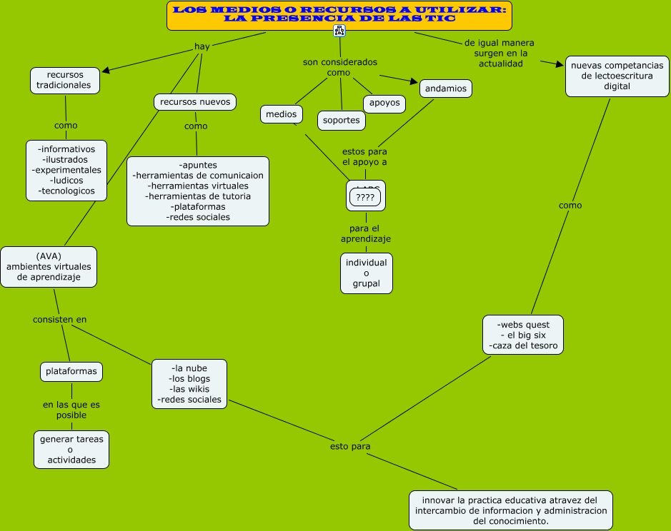 Este Cmap, tiene información relacionada con: CAPITULO 6, LOS MEDIOS O RECURSOS A UTILIZAR: LA PRESENCIA DE LAS TIC hay (AVA) ambientes virtuales de aprendizaje, medios ????, LOS MEDIOS O RECURSOS A UTILIZAR: LA PRESENCIA DE LAS TIC hay recursos nuevos, (AVA) ambientes virtuales de aprendizaje consisten en -la nube -los blogs -las wikis -redes sociales, LOS MEDIOS O RECURSOS A UTILIZAR: LA PRESENCIA DE LAS TIC hay recursos tradicionales, nuevas competancias de lectoescritura digital como -webs quest - el big six -caza del tesoro, recursos nuevos como -apuntes -herramientas de comunicaion -herramientas virtuales -herramientas de tutoria -plataformas -redes sociales, LOS MEDIOS O RECURSOS A UTILIZAR: LA PRESENCIA DE LAS TIC son considerados como soportes, LOS MEDIOS O RECURSOS A UTILIZAR: LA PRESENCIA DE LAS TIC son considerados como medios, LOS MEDIOS O RECURSOS A UTILIZAR: LA PRESENCIA DE LAS TIC son considerados como andamios, (AVA) ambientes virtuales de aprendizaje consisten en plataformas, recursos tradicionales como -informativos -ilustrados -experimentales -ludicos -tecnologicos, LOS MEDIOS O RECURSOS A UTILIZAR: LA PRESENCIA DE LAS TIC de igual manera surgen en la actualidad nuevas competancias de lectoescritura digital, LOS MEDIOS O RECURSOS A UTILIZAR: LA PRESENCIA DE LAS TIC son considerados como apoyos, andamios estos para el apoyo a el ABC, el ABC para el aprendizaje individual o grupal, plataformas en las que es posible generar tareas o actividades, -webs quest - el big six -caza del tesoro esto para innovar la practica educativa atravez del intercambio de informacion y administracion del conocimiento., -la nube -los blogs -las wikis -redes sociales esto para innovar la practica educativa atravez del intercambio de informacion y administracion del conocimiento.