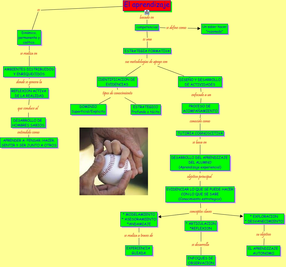 Este Cmap, tiene información relacionada con: CAPITULO 1. APRENDIZAJE ENFOQUE POR COMPETENCIAS, AMBIENTES DISTRIBUIDOS Y ENRIQUECIDOS donde se genera la REFLEXION ACTIVA DE LA REALIDAD, EVIDENCIAR LO QUE SE PUEDE HACER CON LO QUE SE SABE (Conocimiento estrategico) conceptos claves * EXPLORACION * DESVANECIMIENTO, DISEÑO Y DESARROLLO DE ACTIVIDADES enfocado a un PROCESO DE ACOMPAÑAMIENTO, DESARROLLO DEL APRENDIZAJE DEL ALUMNO (Aprendizaje experiencial) objetivo principal EVIDENCIAR LO QUE SE PUEDE HACER CON LO QUE SE SABE (Conocimiento estrategico), El aprendizaje es Dinámico, permanente y caótico., * EXPLORACION * DESVANECIMIENTO su objetivo EL APRENDIZAJE AUTONOMO, ESTRATEGIA FORMATIVA sus metodologias de apoyo son IDENTIFICACION DE EVIDENCIAS, REFLEXION ACTIVA DE LA REALIDAD que conduce al DESARROLLO DE HOMBRES SABIOS, IDENTIFICACION DE EVIDENCIAS tipos de conocimiento DOMINIO Superficial/Explicito, DESARROLLO DE HOMBRES SABIOS entendido como APRENDER A: PENSAR, HACER, SENTIR Y SER JUNTO A OTROS, * ARTICULACION *REFLEXION se desarrolla ENFOQUES DE OBSERVACION, Dinámico, permanente y caótico. se realiza en AMBIENTES DISTRIBUIDOS Y ENRIQUECIDOS, PROCESO DE ACOMPAÑAMIENTO conocido como TUTORIA COGNOSCITIVA, EVIDENCIAR LO QUE SE PUEDE HACER CON LO QUE SE SABE (Conocimiento estrategico) conceptos claves * ARTICULACION *REFLEXION, TUTORIA COGNOSCITIVA se basa en DESARROLLO DEL APRENDIZAJE DEL ALUMNO (Aprendizaje experiencial), EVIDENCIAR LO QUE SE PUEDE HACER CON LO QUE SE SABE (Conocimiento estrategico) conceptos claves * MODELAMIENTO * ASESORAMIENTO *ANDAMIAJE, ESTRATEGIA FORMATIVA sus metodologias de apoyo son DISEÑO Y DESARROLLO DE ACTIVIDADES, IDENTIFICACION DE EVIDENCIAS tipos de conocimiento ESTRATEGICO Profundo o tácito, * MODELAMIENTO * ASESORAMIENTO *ANDAMIAJE se realiza a traves de EXPERIENCIA GUIADA, competencias es una ESTRATEGIA FORMATIVA