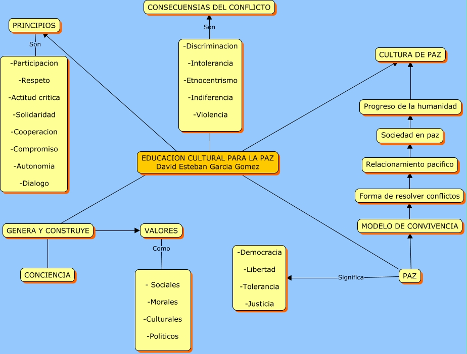 Este Cmap, tiene información relacionada con: Mapa Central, PAZ ???? MODELO DE CONVIVENCIA, Progreso de la humanidad ???? CULTURA DE PAZ, EDUCACION CULTURAL PARA LA PAZ David Esteban Garcia Gomez ???? CULTURA DE PAZ, Sociedad en paz ???? Progreso de la humanidad, EDUCACION CULTURAL PARA LA PAZ David Esteban Garcia Gomez ???? PAZ, Relacionamiento pacifico ???? Sociedad en paz, GENERA Y CONSTRUYE ???? VALORES, MODELO DE CONVIVENCIA ???? Forma de resolver conflictos, GENERA Y CONSTRUYE ???? CONCIENCIA, EDUCACION CULTURAL PARA LA PAZ David Esteban Garcia Gomez ???? GENERA Y CONSTRUYE, PRINCIPIOS Son -Participacion -Respeto -Actitud critica -Solidaridad -Cooperacion -Compromiso -Autonomia -Dialogo, PAZ Significa -Democracia -Libertad -Tolerancia -Justicia, EDUCACION CULTURAL PARA LA PAZ David Esteban Garcia Gomez ???? CONSECUENSIAS DEL CONFLICTO, CONSECUENSIAS DEL CONFLICTO Son -Discriminacion -Intolerancia -Etnocentrismo -Indiferencia -Violencia, VALORES Como - Sociales -Morales -Culturales -Politicos, Forma de resolver conflictos ???? Relacionamiento pacifico, EDUCACION CULTURAL PARA LA PAZ David Esteban Garcia Gomez ???? PRINCIPIOS