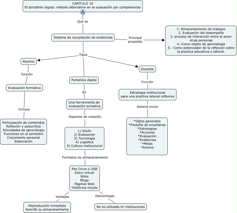 Este Cmap, tiene información relacionada con: CAPITULO 10, Sistema de recopilación de evidencias Tipos Portafolio digital, Sistema de recopilación de evidencias Principal propósito 1. Almacenamiento de trabajos 2. Evaluación del desempeño 3. proceso de interacción entre el autor otras personas 4.-Como objeto de aprendizaje 5.- Como potenciador de la reflexión sobre la practica educativa o laboral., Portafolio digital Es Una herramienta de evaluación sumativa, CAPITULO 10 El portafolio digital: método alternativo en la evaluación por competencias Qué es Sistema de recopilación de evidencias, Pen Drive o USB Disco virtual Wikis Blogs Paginas Web Telefonos movile Ventajas Reproducción inmediata Sencillo su almacenamiento, 1) Visión 2) Evaluación 3) Tecnologia 4) Logistica 5) Cultura institucional Formatos de almacenamiento Pen Drive o USB Disco virtual Wikis Blogs Paginas Web Telefonos movile, Docente Función Estrategia institucional para una practiva laboral reflexiva, Alumno función Evaluación formativa, Sistema de recopilación de evidencias Tipos Alumno, Evaluación formativa Incluye Participación de contenidos Reflexión y autocritica Actividades de aprendizaje Funciones en el semestre Crecimiento personal Elaboración, Estrategia institucional para una practiva laboral reflexiva Deberá incluir *Datos generales *Filosofia de enseñanza *Estrategias *Acciones *Evaluación *Evidencias *Metas *Anexos, Pen Drive o USB Disco virtual Wikis Blogs Paginas Web Telefonos movile Desventajas No es utilizada en instituciones, Una herramienta de evaluación sumativa Aspectos de creación 1) Visión 2) Evaluación 3) Tecnologia 4) Logistica 5) Cultura institucional, Sistema de recopilación de evidencias Tipos Docente
