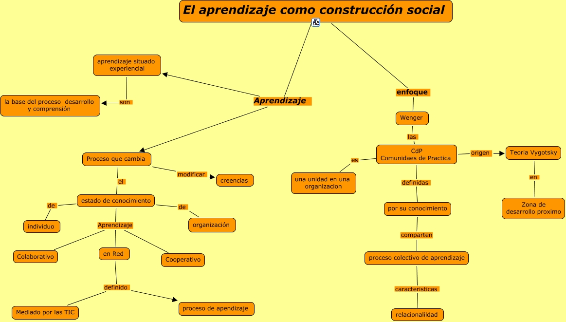 Este Cmap, tiene información relacionada con: CAPITULO -2, El aprendizaje como construcción social Aprendizaje aprendizaje situado experiencial, CdP Comunidaes de Practica es una unidad en una organizacion, en Red definido proceso de apendizaje, estado de conocimiento de individuo, Proceso que cambia el estado de conocimiento, El aprendizaje como construcción social enfoque Wenger, estado de conocimiento de organización, El aprendizaje como construcción social Aprendizaje Proceso que cambia, aprendizaje situado experiencial son la base del proceso desarrollo y comprensión, Proceso que cambia modificar creencias, estado de conocimiento Aprendizaje en Red, estado de conocimiento Aprendizaje Colaborativo, CdP Comunidaes de Practica origen Teoria Vygotsky, CdP Comunidaes de Practica definidas por su conocimiento, estado de conocimiento Aprendizaje Cooperativo, en Red definido Mediado por las TIC, Wenger las CdP Comunidaes de Practica, proceso colectivo de aprendizaje caracteristicas relacionalildad, Teoria Vygotsky en Zona de desarrollo proximo, por su conocimiento comparten proceso colectivo de aprendizaje
