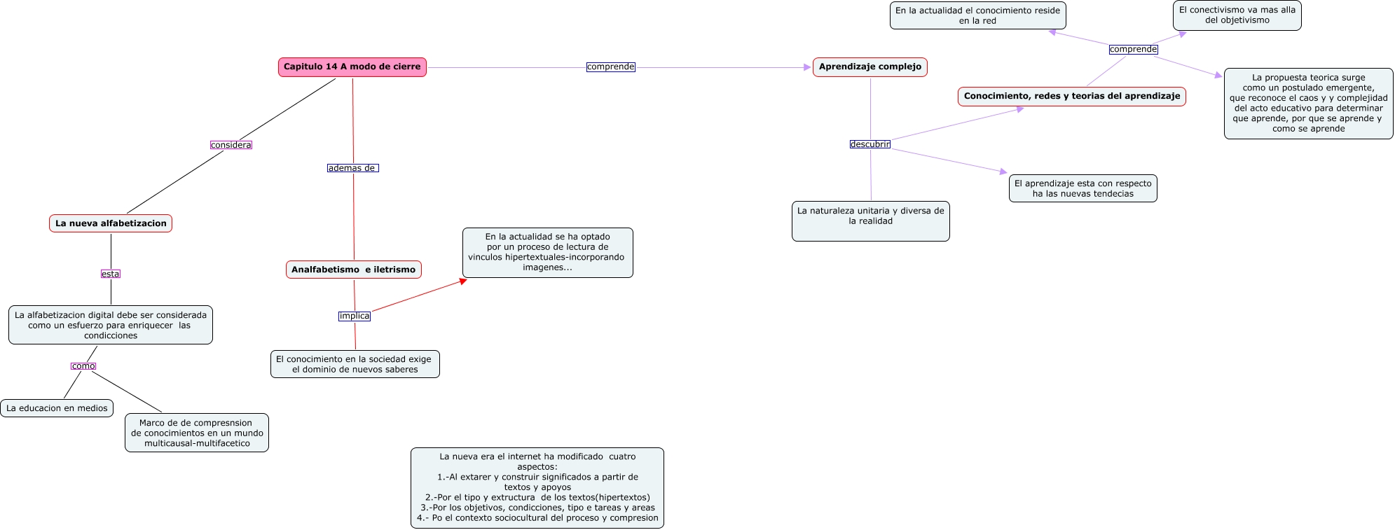 Este Cmap, tiene información relacionada con: capitulo XIV A modo de cierre, Conocimiento, redes y teorias del aprendizaje comprende La propuesta teorica surge como un postulado emergente, que reconoce el caos y y complejidad del acto educativo para determinar que aprende, por que se aprende y como se aprende, Conocimiento, redes y teorias del aprendizaje comprende En la actualidad el conocimiento reside en la red, Capitulo 14 A modo de cierre ademas de Analfabetismo e iletrismo, Aprendizaje complejo descubrir Conocimiento, redes y teorias del aprendizaje, Analfabetismo e iletrismo implica El conocimiento en la sociedad exige el dominio de nuevos saberes, Aprendizaje complejo descubrir La naturaleza unitaria y diversa de la realidad, Aprendizaje complejo descubrir El aprendizaje esta con respecto ha las nuevas tendecias, Analfabetismo e iletrismo implica En la actualidad se ha optado por un proceso de lectura de vinculos hipertextuales-incorporando imagenes..., La alfabetizacion digital debe ser considerada como un esfuerzo para enriquecer las condicciones como Marco de de compresnsion de conocimientos en un mundo multicausal-multifacetico, Capitulo 14 A modo de cierre considera La nueva alfabetizacion, La nueva alfabetizacion esta La alfabetizacion digital debe ser considerada como un esfuerzo para enriquecer las condicciones, Conocimiento, redes y teorias del aprendizaje comprende El conectivismo va mas alla del objetivismo, La alfabetizacion digital debe ser considerada como un esfuerzo para enriquecer las condicciones como La educacion en medios, Capitulo 14 A modo de cierre comprende Aprendizaje complejo