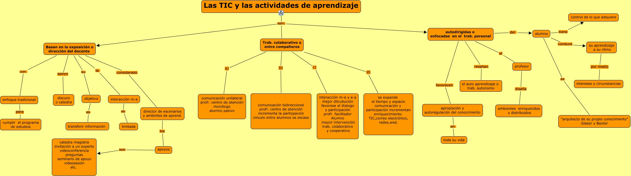 Este Cmap, tiene información relacionada con: CAPITULO-7, autodirigidas o enfocadas en el trab. personal resaltan el auto aprendizaje o trab. autonomo, autodirigidas o enfocadas en el trab. personal el profesor, Trab. colaborativo o entre compañeros d) se expande el tiempo y espacio comunicación y participación incrementan enriquecimiento TIC,correo electrónico, redes,wed., profesor diseña ambientes enriquecidos y distribuidos, alumno tiene control de lo que adquiere, Trab. colaborativo o entre compañeros c) interacción m-a y a-a mejor ditrubución favorese el dialogo y participación profr. facilitador Alumno mayor intervención trab. colaborativo y cooperativo, Las TIC y las actividades de aprendizaje son: Basan en la exposición o dirección del docente, autodirigidas o enfocadas en el trab. personal del alumno, Basan en la exposición o dirección del docente apoyo discuro o catedra, Basan en la exposición o dirección del docente su objetivo, Las TIC y las actividades de aprendizaje son: autodirigidas o enfocadas en el trab. personal, enfoque tradicional para cumplir el programa de estudios, interacción m-a es limitada, director de escenarios y ambintes de aprend. los apoyos, objetivo es transferir información, alumno conduce su aprendizaje a su ritmo, Las TIC y las actividades de aprendizaje son: Trab. colaborativo o entre compañeros, apoyos son catedra magistra invitación a un experto videoconferencia preguntas seminario de apoyo videosesión etc., Basan en la exposición o dirección del docente con enfoque tradicional, apropiación y autoregulación del conocimiento en toda su vida