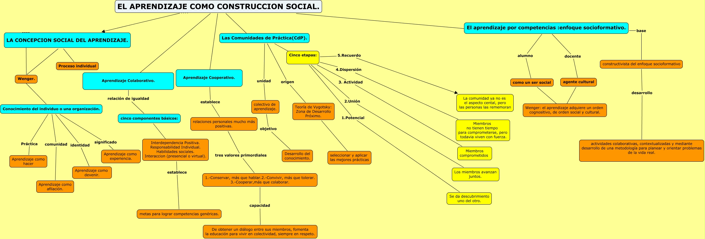 Este Cmap, tiene información relacionada con: Mapa capitulo 2 ana, EL APRENDIZAJE COMO CONSTRUCCION SOCIAL. ???? LA CONCEPCION SOCIAL DEL APRENDIZAJE., LA CONCEPCION SOCIAL DEL APRENDIZAJE. Aprendizaje Proceso individual, Conocimiento del individuo o una organización. identidad Aprendizaje como devenir., Interdependencia Positiva. Responsabilidad Individual. Habilidades sociales. Interaccion (presencial o virtual). establece metas para lograr competencias genéricas., Cinco etapas: 3. Actividad Miembros comprometidos, constructivista del enfoque socioformativo desarrollo actividades colaborativas, contextualizadas y mediante desarrollo de una metodología para planear y orientar problemas de la vida real., Cinco etapas: 2.Unión Los miembros avanzan juntos., LA CONCEPCION SOCIAL DEL APRENDIZAJE. ???? Wenger., LA CONCEPCION SOCIAL DEL APRENDIZAJE. Aprendizaje Wenger., EL APRENDIZAJE COMO CONSTRUCCION SOCIAL. ???? Las Comunidades de Práctica(CdP)., agente cultural ???? Wenger: el aprendizaje adquiere un orden cognositivo, de orden social y cultural., como un ser social ???? Wenger: el aprendizaje adquiere un orden cognositivo, de orden social y cultural., Cinco etapas: 5.Recuerdo La comunidad ya no es el aspecto cental, pero las personas las rememoran, Las Comunidades de Práctica(CdP). ???? Cinco etapas:, Cinco etapas: 4.Dispersión Miembros no tienen tiempo para comprometerse, pero todavia viven con fuerza., Aprendizaje Cooperativo. establece relaciones personales mucho más positivas., El aprendizaje por competencias :enfoque socioformativo. alumno como un ser social, El aprendizaje por competencias :enfoque socioformativo. docente agente cultural, relaciones personales mucho más positivas. tres valores primordiales 1.-Conservar, más que hablar.2.-Convivir, más que tolerar. 3.-Cooperar,más que colaborar., EL APRENDIZAJE COMO CONSTRUCCION SOCIAL. ???? Aprendizaje Cooperativo.