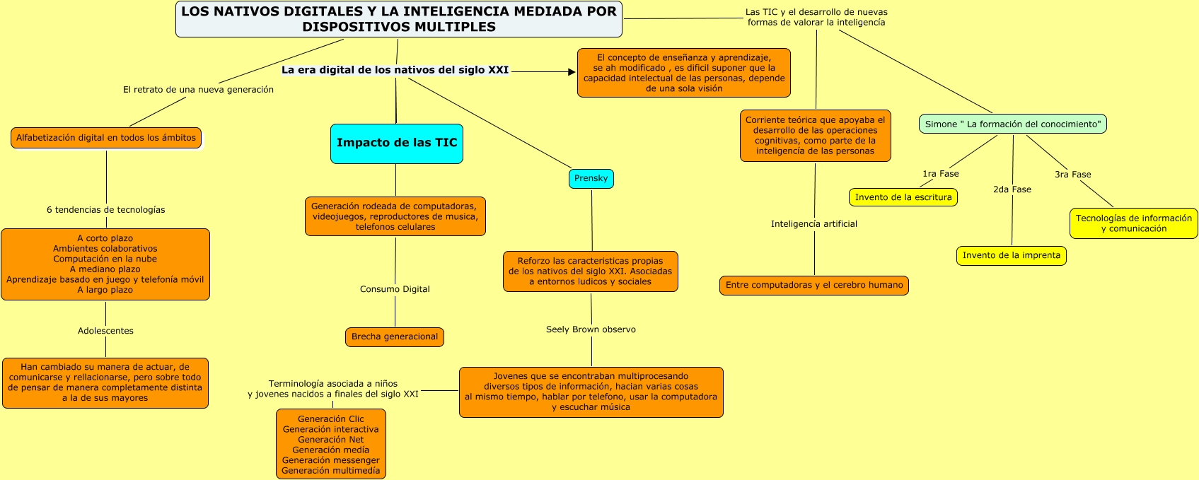 Este Cmap, tiene información relacionada con: mapa capitulo 13, LOS NATIVOS DIGITALES Y LA INTELIGENCIA MEDIADA POR DISPOSITIVOS MULTIPLES Las TIC y el desarrollo de nuevas formas de valorar la inteligencía Corriente teórica que apoyaba el desarrollo de las operaciones cognitivas, como parte de la inteligencía de las personas, Corriente teórica que apoyaba el desarrollo de las operaciones cognitivas, como parte de la inteligencía de las personas Inteligencía artificial Entre computadoras y el cerebro humano, Generación rodeada de computadoras, videojuegos, reproductores de musica, telefonos celulares Consumo Digital Brecha generacional, LOS NATIVOS DIGITALES Y LA INTELIGENCIA MEDIADA POR DISPOSITIVOS MULTIPLES La era digital de los nativos del siglo XXI Prensky, Prensky ???? Reforzo las caracteristicas propias de los nativos del siglo XXI. Asociadas a entornos ludicos y sociales, A corto plazo Ambientes colaborativos Computación en la nube A mediano plazo Aprendizaje basado en juego y telefonía móvil A largo plazo Adolescentes Han cambiado su manera de actuar, de comunicarse y rellacionarse, pero sobre todo de pensar de manera completamente distinta a la de sus mayores, Alfabetización digital en todos los ámbitos 6 tendencias de tecnologías A corto plazo Ambientes colaborativos Computación en la nube A mediano plazo Aprendizaje basado en juego y telefonía móvil A largo plazo, Reforzo las caracteristicas propias de los nativos del siglo XXI. Asociadas a entornos ludicos y sociales Seely Brown observo Jovenes que se encontraban multiprocesando diversos tipos de información, hacian varias cosas al mismo tiempo, hablar por telefono, usar la computadora y escuchar música, Simone " La formación del conocimiento" 2da Fase Invento de la imprenta, LOS NATIVOS DIGITALES Y LA INTELIGENCIA MEDIADA POR DISPOSITIVOS MULTIPLES La era digital de los nativos del siglo XXI Impacto de las TIC, LOS NATIVOS DIGITALES Y LA INTELIGENCIA MEDIADA POR DISPOSITIVOS MULTIPLES La era digital de los nativos del siglo XXI El concepto de enseñanza y aprendizaje, se ah modificado , es dificil suponer que la capacidad intelectual de las personas, depende de una sola visión, Jovenes que se encontraban multiprocesando diversos tipos de información, hacian varias cosas al mismo tiempo, hablar por telefono, usar la computadora y escuchar música Terminología asociada a niños y jovenes nacidos a finales del siglo XXI Generación Clic Generación interactiva Generación Net Generación medía Generación messenger Generación multimedía, LOS NATIVOS DIGITALES Y LA INTELIGENCIA MEDIADA POR DISPOSITIVOS MULTIPLES La era digital de los nativos del siglo XXI Generación rodeada de computadoras, videojuegos, reproductores de musica, telefonos celulares, Simone " La formación del conocimiento" 3ra Fase Tecnologías de información y comunicación, Simone " La formación del conocimiento" 1ra Fase Invento de la escritura, LOS NATIVOS DIGITALES Y LA INTELIGENCIA MEDIADA POR DISPOSITIVOS MULTIPLES El retrato de una nueva generación Alfabetización digital en todos los ámbitos, LOS NATIVOS DIGITALES Y LA INTELIGENCIA MEDIADA POR DISPOSITIVOS MULTIPLES Las TIC y el desarrollo de nuevas formas de valorar la inteligencía Simone " La formación del conocimiento"