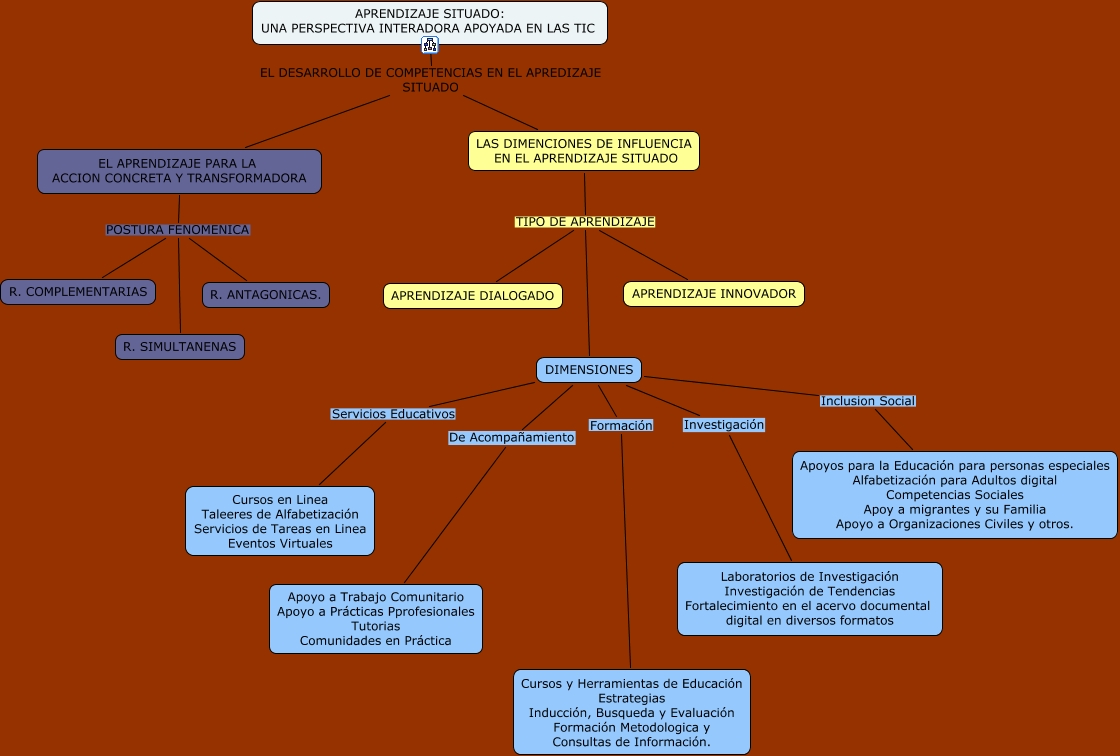 Este Cmap, tiene información relacionada con: CAPITULO K, APRENDIZAJE SITUADO: UNA PERSPECTIVA INTERADORA APOYADA EN LAS TIC EL DESARROLLO DE COMPETENCIAS EN EL APREDIZAJE SITUADO LAS DIMENCIONES DE INFLUENCIA EN EL APRENDIZAJE SITUADO, DIMENSIONES Investigación Laboratorios de Investigación Investigación de Tendencias Fortalecimiento en el acervo documental digital en diversos formatos, DIMENSIONES Inclusion Social Apoyos para la Educación para personas especiales Alfabetización para Adultos digital Competencias Sociales Apoy a migrantes y su Familia Apoyo a Organizaciones Civiles y otros., APRENDIZAJE SITUADO: UNA PERSPECTIVA INTERADORA APOYADA EN LAS TIC EL DESARROLLO DE COMPETENCIAS EN EL APREDIZAJE SITUADO EL APRENDIZAJE PARA LA ACCION CONCRETA Y TRANSFORMADORA, EL APRENDIZAJE PARA LA ACCION CONCRETA Y TRANSFORMADORA POSTURA FENOMENICA R. COMPLEMENTARIAS, DIMENSIONES Formación Cursos y Herramientas de Educación Estrategias Inducción, Busqueda y Evaluación Formación Metodologica y Consultas de Información., DIMENSIONES De Acompañamiento Apoyo a Trabajo Comunitario Apoyo a Prácticas Pprofesionales Tutorias Comunidades en Práctica, LAS DIMENCIONES DE INFLUENCIA EN EL APRENDIZAJE SITUADO TIPO DE APRENDIZAJE APRENDIZAJE DIALOGADO, LAS DIMENCIONES DE INFLUENCIA EN EL APRENDIZAJE SITUADO TIPO DE APRENDIZAJE DIMENSIONES, EL APRENDIZAJE PARA LA ACCION CONCRETA Y TRANSFORMADORA POSTURA FENOMENICA R. ANTAGONICAS., LAS DIMENCIONES DE INFLUENCIA EN EL APRENDIZAJE SITUADO TIPO DE APRENDIZAJE APRENDIZAJE INNOVADOR, EL APRENDIZAJE PARA LA ACCION CONCRETA Y TRANSFORMADORA POSTURA FENOMENICA R. SIMULTANENAS, DIMENSIONES Servicios Educativos Cursos en Linea Taleeres de Alfabetización Servicios de Tareas en Linea Eventos Virtuales